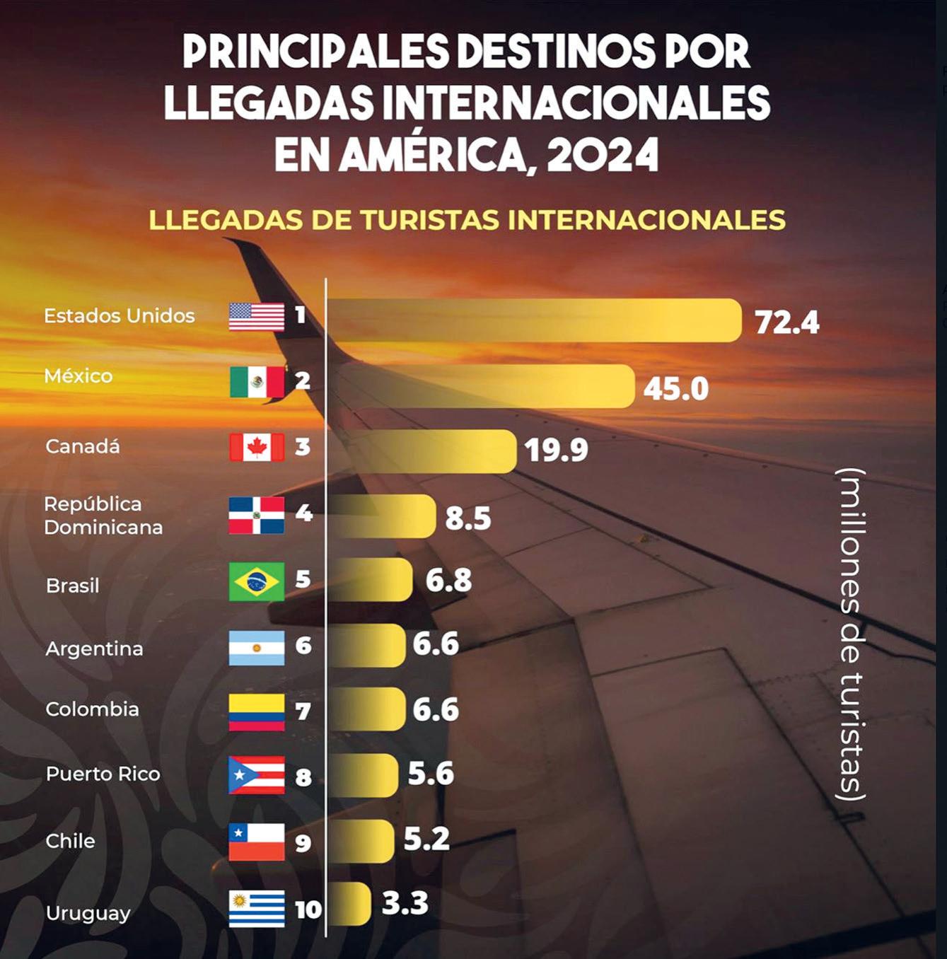 El organismo de Naciones Unidas situó a México sólo detrás de Estados Unidos, que registró 72.4 millones de visitantes, y por encima de Canadá (19.9 millones) y República Dominicana (8.5 millones). La secretaria de Turismo mexicana, Josefina Rodríguez Zamora, subrayó que estos resultados confirman la posición estratégica del país y el reconocimiento mundial a su oferta cultural,