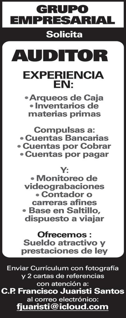 INFORMES AL 844-41070-55 O ENVIAR CURRICULUM A ventas_saltillo@carvil.com.mx