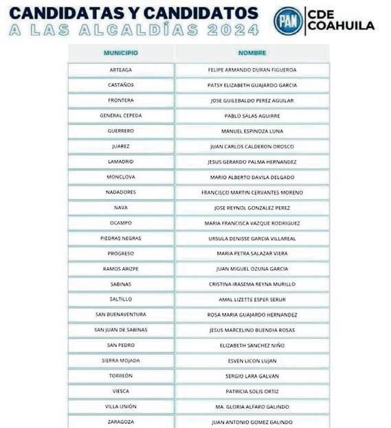 La tarde de este miércoles el Comité Ejecutivo Estatal del Partido Acción Nacional anunció que irá por 24 de las 38 alcaldías de Coahuila.