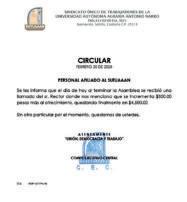 nómico al sindicato, aumentando la cifra del “bono de apoyo” de 4 mil pesos, que cada inicio de año se otorga a los dos sindicatos: el de administrativos y el de académicos. Lo anterior se corrobora con la circular enviada por el SUTUAAAN a sus agremiados, fechada el 20 de febrero, que dice: “Se les informa que el día de hoy (jueves) al terminar la Asamblea, se recibió una llamada del sr. rector donde nos menciona que se incrementa $500 pesos más al ofrecimiento, quedando finalmente en $4,500”. Tras ese ofrecimiento, extrañamente cambió la opinión del 82% de los miembros del sindicato, que el jueves votaron contra la propuesta de la Rectoría, pero ayer, al acudir a las urnas, 674 trabajadores votaron en contra de estallar la huelga, 117 a favor del paro laboral y 22 votos nulos, según el resultado del conteo emitido después de las 18:00 horas.