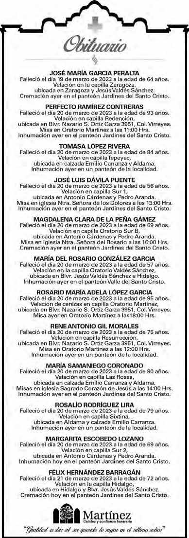 CON PAPELERIA OFICIAL RECEPCIONISTA Y SECRETARIAS EMPRESA IMPORTANTE SOLICITA PERSONAL MASCULINO, DE 30 A 55 AÑOS, PARA CUBRIR RECEPCION NOCTURNA DE 10 PM A 8 AM DE LUNES A SABADO.. INFORMES AL 844-438-1800 EXT 113 VARIOS CHOFERES .EMPRESA IMPORTANTE SOLICITA CHOFERES, DE 30 A 58 AÑOS, QUE CUENTE CON LICENCIA VIGENTE Y MANEJE VEHICULO ESTANDAR, AMPLIO CONOCIMIENTO DE LA CIUDAD, DISPONIBILIDAD DE HORARIOY DE VIAJAR. INTERESADOS PRESENTARSE EN MIGUEL HIDALGO #1228, CASI ESQUINA CON FRANCISCO COSS O COMUNICARSE AL 844 41444 85. ENTREVISTAS DE LUNES A VIERNES DE 9;00 A 1;00 PM Y DE 4;00 A 6;00 PM. OFRECEMOS PAGO SEMANAL, VALES DE DESPENSA Y PRESTACIONES DE LEY, CONTRATACION INMEDIATA, PRESENTARSE CON PAPELERIA OFICIAL 6F Clasificados ZÓCALO SALTILLO Miércoles 22 de marzo del 2023 NORTE NISSAN OTROS DODGE OFICINA