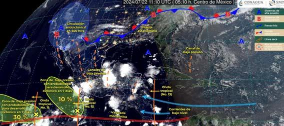 “Se prevé que a partir del martes 23 de julio (hoy) y hasta el viernes 26 de julio, un canal de baja presión se extienda sobre el noreste del territorio nacional, en interacción con un sistema frontal (fuera de temporada) que se localizará cerca de la frontera norte de México, con divergencia en altura y con el ingreso de humedad de ambos litorales”, señala el comunicado de la Comisión Nacional del Agua “Originará lluvias fuertes a muy fuertes con puntuales intensas, acompañadas de actividad eléctrica, posible caída de granizo y rachas de viento entre 50 a 70 kilómetros por hora en Coahuila, Nuevo León y el norte de Tamaulipas, sin descartar la posible formación de torbellinos en zonas de la región de pronóstico”.