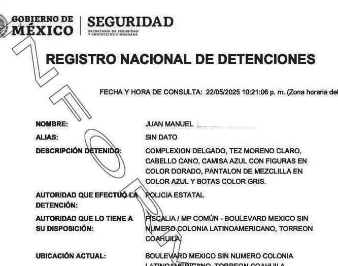 El empresario lagunero, Juan Manuel “N”, fue detenido ayer por la Policía Estatal en la ciudad de Torreón y puesto a disposición de la Fiscalía General, según el Registro Nacional de Detenciones. La ficha expedida por este portal de la Secretaría de Seguridad y Protección Ciu-