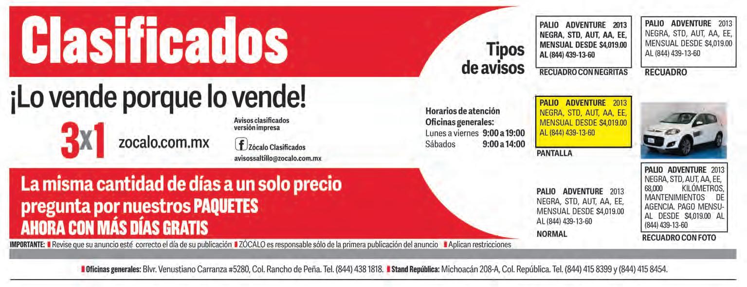TECNICENTRO SM SOLICITA MECANICOS EN GENERAL. PRESENTARSE CON SOLICITUD EN BOULEVARD JESUS VALDEZ SANCHEZ 625 ESQUINA CON NAVA COLONIA REPUBLICA. TELEFONO. 844-416-60-77
