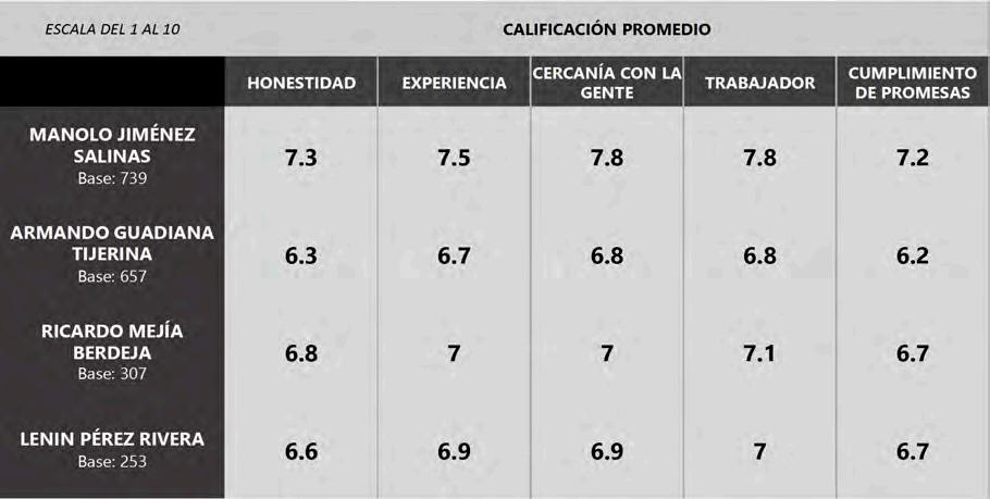 En cuanto a algunas variables, como honestidad, experiencia, cercanía con la gente, trabajador y cumplidor de promesas, en las cinco resulta Manolo Jiménez como mejor calificado, con un promedio de 7.5, en contraparte, el promedio de Armando Guadiana es de 6.5, según los resultados presentados por la encuestadora.