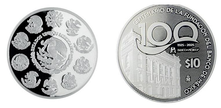 La pieza, acuñada por la Casa de Moneda de México, tiene un valor facial de 10 pesos y contiene dos onzas de plata pura de ley 0.999. En el anverso muestra el Escudo Nacional en relieve rodeado de emblemas históricos y el águila del Códice Mendocino, mientras que en el reverso aparece el edificio principal del Banco de México junto con la leyenda “Centenario de la Fundación del Banco de México”.