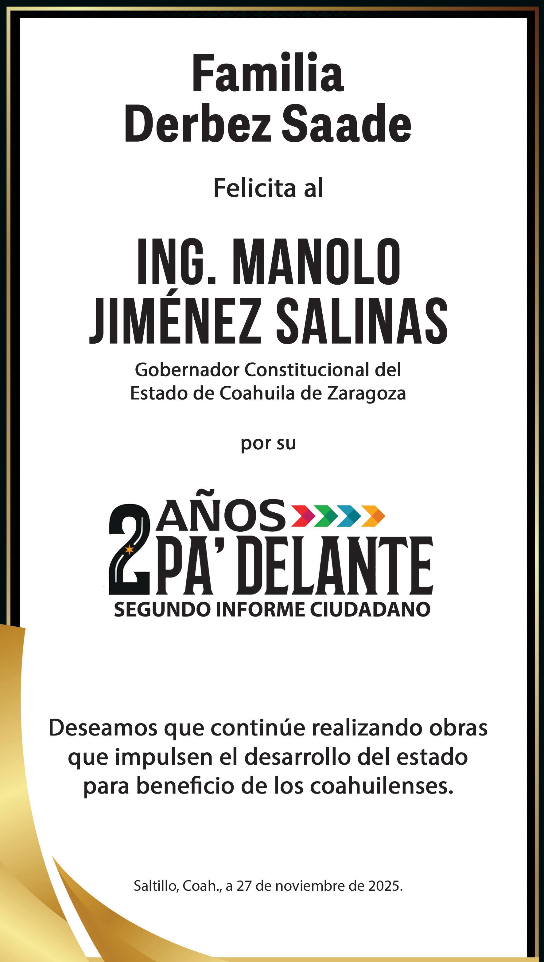 “En Coahuila no vamos ni pa la izquierda, ni pa la derecha. Aquí vamos puro pa’delante, aquí nos mantenemos en el centro, para ser punto de encuentro entre todas y todos los que queremos hacer cosas buenas por esta tierra bendita”, declaró Manolo Jiménez. Referente Manifestó que por eso Coahuila es un referente a nivel nacional, al ser el mejor estado para vivir, porque es tierra norteña, llena de gente buena, trabajadora y “echada pa’delante”, con la que se ha logrado los indicadores positivos de todo el país, por lo que volvió a hace un llamado a los coahuilenses.