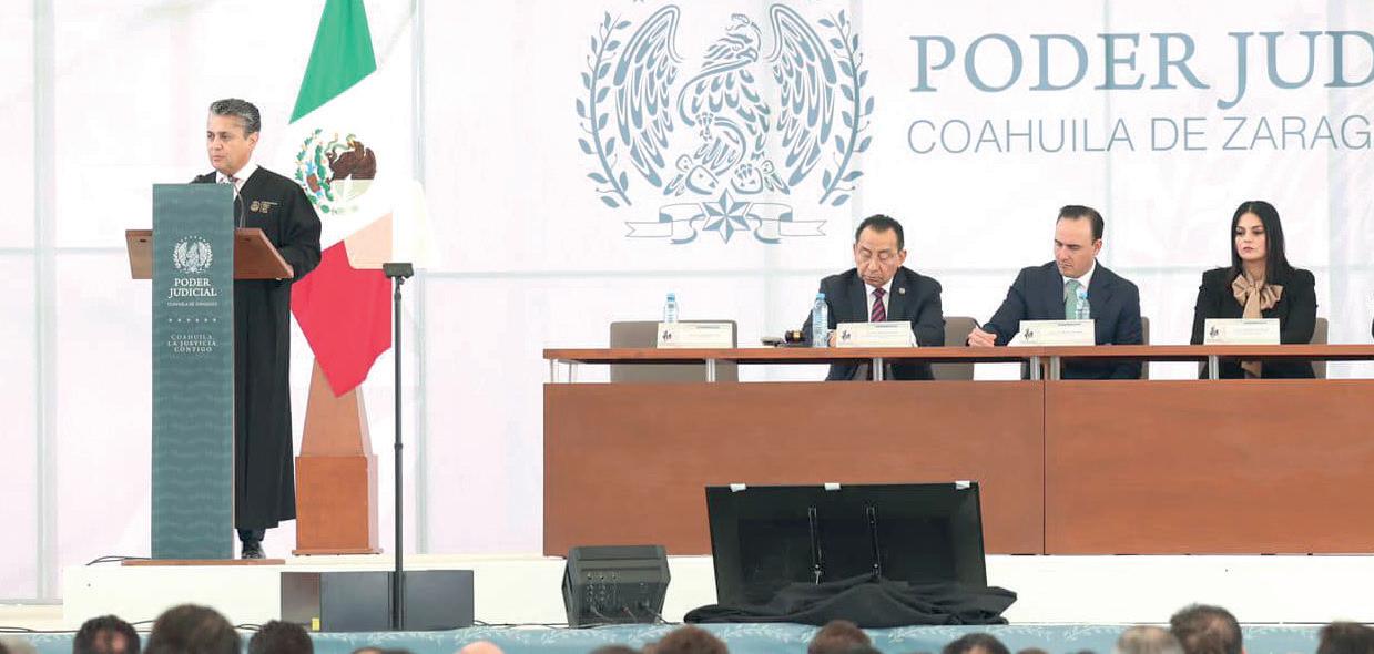 El gobernador Manolo Jiménez Salinas destacó ayer que Coahuila cuente con un Poder Judicial fuerte abona a la estabilidad, a la gobernabilidad y al estado de derecho, durante su asistencia en el Centro de Convenciones de Torreón al Cuarto Informe del magistrado Miguel Felipe Mery Ayup, presidente del Tribunal Superior de Justicia del Estado. “Queremos reiterar nuestro compromiso hacia todo Coahuila, de trabajar con responsabilidad, de avanzar haciendo las cosas bien. Que todo lo que hagamos el Poder Ejecutivo, el Poder Judicial y el Poder Legislativo sea para bien de Coahuila”, expresó. Con la presencia de Rafael Guerra Álvarez, magistrado presidente del Poder Judicial de la Ciudad de México y de la Comisión Nacional de Tribunales Superiores de Justicia; así como de Luz Elena Morales Núñez, diputada presidenta de la Junta de Gobierno del Congreso local, el Mandatario estatal felicitó a todos quienes integran el Poder Ju-