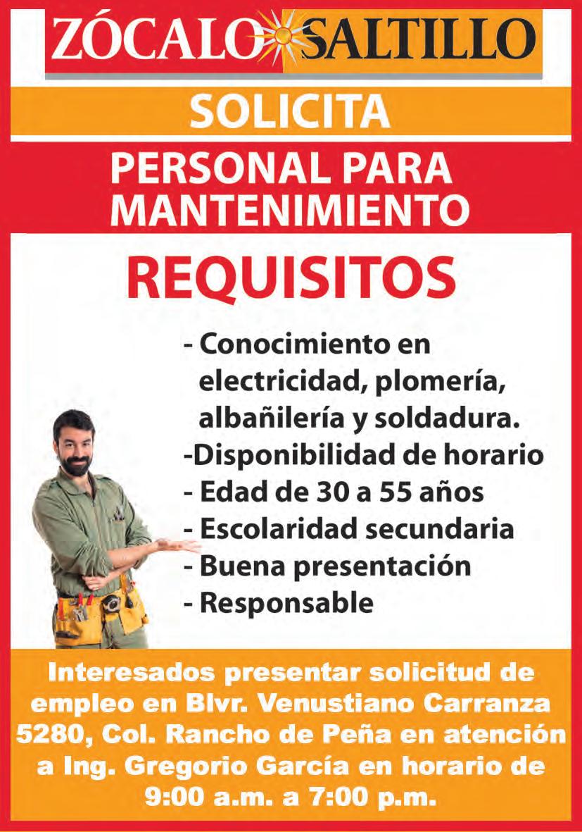 INSTITUCION EDUCATIVA UBICADA AL NORTE DE SALTILLO, SOLICITA PERSONAL MASCULINO PARA INTENDENCIA., OFRECEMOS BUEN SUELDO, PRESTACIONES SUPERIORES A LAS DE LEY, EXCELENTE AMBIENTE DE TRABAJO. REQUISITOS INDISPENSABLES EDAD DE 18 A 55 AÑOS, QUE VIVA AL NORTE DE SALTILLO O EN RAMOS ARIZPE SOLICITUD PRINTAFORM, 2 CARTAS DE RECOMENDACION, CARTA DE NO ANTECEDENTES PENALES, INTERESADOS FAVOR DE COMUNICARSE ALTELEFONOS. 844-43985-84, 844-439-87-75 EXT. 14Y WHATSAPP 844-15995-77.