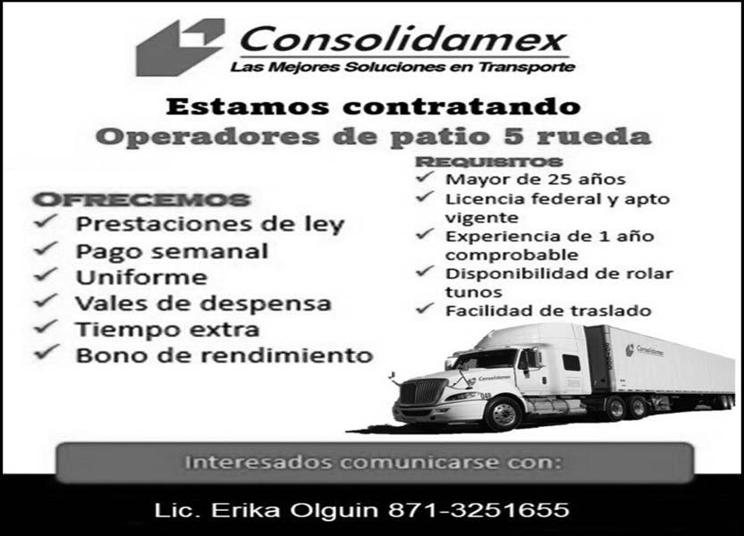 VACANTE PARA OPERADOR 3.5 LOCAL Y FORANEO LICENCIA VIGENTE MAYOR DE 30 AÑOS EXPERIENCIA COMPROBABLE CEL 844-286-00-29