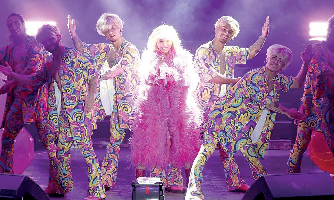 Patines multicolores y un increíble oso gigante como es cenografía, reinterpretó Yo te Amo, te Amo, al ritmo mun dial de la melodía Barbie Girl –ella, con minivestido y botas; ellos, en bermudas y camisas abiertas multicolor– un estalli do energético de pura nostal gia ochentera.