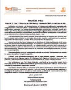 A través de un comunicado, la Secretaría de Educación de Coahuila reprobó enérgicamente la agresión cometida en contra del profesor Héctor y expresó su respaldo a la familia y a todas la maestras y maestros de la comunidad educativa.