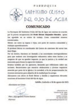 z La comunidad saltillense se mostró indignada tras la agresión contra el maestro de la secundaria 8. Desde ayer por la noche circula la convocatoria para protestar este domingo, a las 10:00 horas, en la explanada del Tec Saltillo, bajo el lema “Maestros seguros en las escuelas”. z Por su parte, la Sección 5 del SNTE emitió un comunicado en el que condenó los actos de violencia cometidos contra el profesor Héctor, y extendió su respaldo a todo el personal docente. La dirigencia sindical calificó la agresión como “lamentable y cobarde”, y subrayó que la escuela debe ser siempre un santuario de aprendizaje, respeto y paz.
