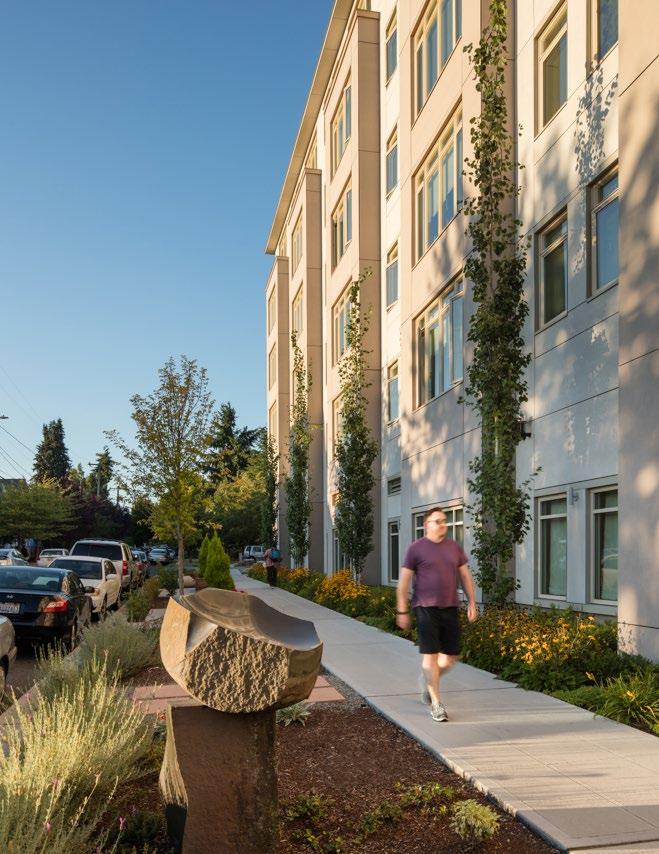 The building’s frontage along Madison Street and adjacency to 23rd Avenue, another busy cross-town thoroughfare, reflects some of Capitol Hill’s quintessential design characteristics. High-quality brickwork, storefronts and massing inspired by traditional commercial buildings in the neighborhood and a lushly landscaped sidewalk and fullwidth canopies create an inviting space that allows for pedestrians and transit riders to congregate under and around. Being on a busy bus corridor (the new Rapid Ride bus rapid transit line runs right in front of this frontage) makes Aegis Madison’s location easy for staff and visitors to arrive via multiple transit lines.