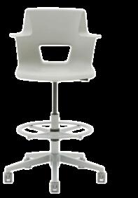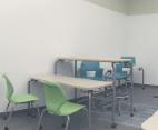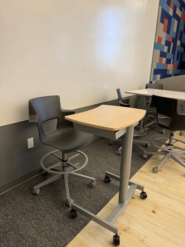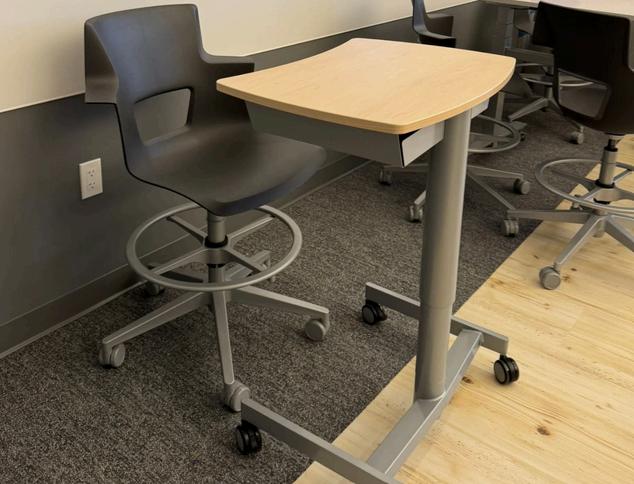 Durable furniture with non-rolling chairs for students (soft seating areas are also durable and easy to clean).