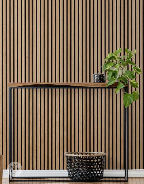 Wood elements throughout (wall, floor, furniture)