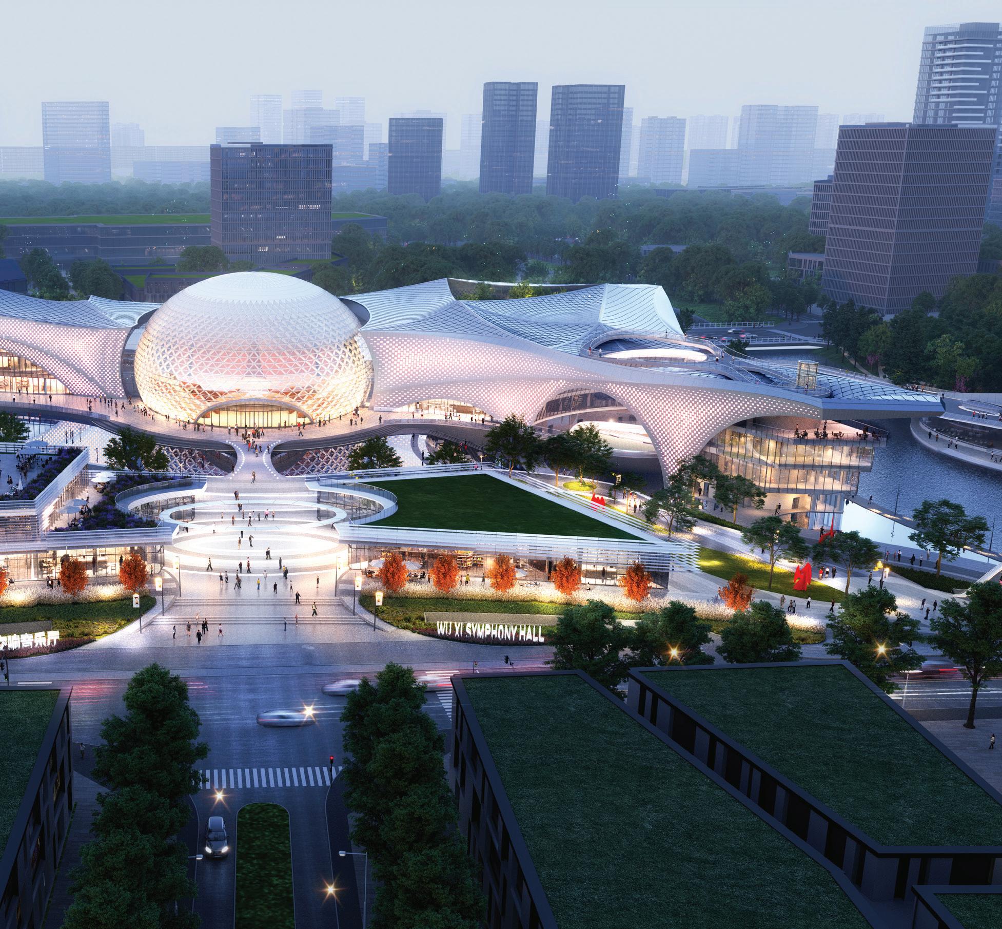 In fact, Perkins Eastman won the opportunity last spring to design the Wuxi Taihu-Bay International Culture and Arts Exchange after a Herculean twomonth effort that involved Pfeiffer’s studios in Los Angeles and New York and Perkins Eastman’s studios in New York and Shanghai. The effort included working long hours through a lockdown in Shanghai. The winning design concept, “Moonrise,” mixes culture and civic life. The design radiates from the stage of its world-class, 1,500-seat symphony hall. The
