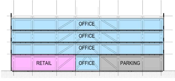 Note: Other residential tower configurations are possible but not developed in this study. An L-shaped tower would allow a large garden deck on the podium roof. Alternately, two residential towers each served by two stairs and two elevators could be designed. The office podium could also be reduced in height and converted to two stories of retail and parking allowing for more floors of residential. Inset balconies for each of the residential units are also possible provided that they utilize a sloped finished surface that can be disassembled.