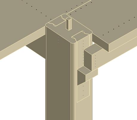 The structure should be disassembled in the reverse order of assembly to ensure structural stability. The majority of structural elements are designed to be stable even when screws are removed from the primary wood elements. Vertical structural loads are transferred by means of bearing surfaces. Thus, removal of screws from primary wood elements does not pose a risk of collapse. The screws are provided to limit differential deflection of decks and to secure elements against uplift and lateral (seismic or wind) loads. Thus, during demolition, removal of screw fasteners can proceed quickly and after screws are removed, cranes can quickly remove elements. This approach is different from disassembly of steel beams, for example, which typically require continuous crane-picking support during disassembly so that elements do not fall when fasteners are removed. The approach is also different from reinforced concrete construction, which cannot be disassembled.