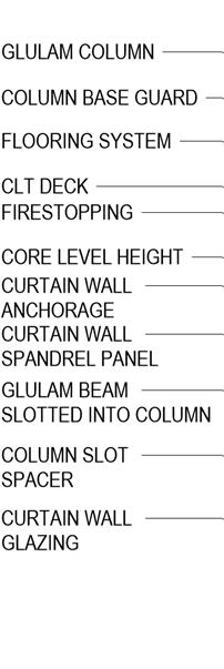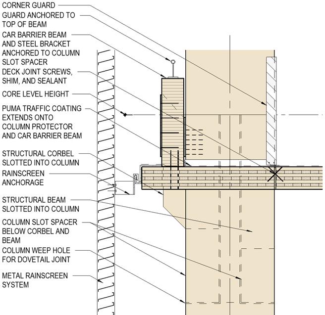 Phase 1 was designed to the requirements of Type IV-HT with the anticipation of Type IV-B in future phases; however, Phase 1 does not include a 1" or thicker noncombustible covering on the floor decks. It was not included because parking garage performance criteria do not necessitate the concrete topping, which traps moisture below, leading to decay of the wood in the weather-exposed environment of the open-air garage. However, Phase 2 curtain wall cladding protects the interior from weather and the 1" noncombustible covering requirement is met with two layers of ½" concrete panels in the floor assembly. The construction type is changed to Type IV-B, allowing greater building area, number of floors, and height for business occupancies than allowed by IV-HT.