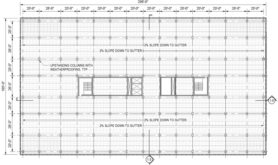 Phase 3 adds a seven-floor residential tower over the Phase 2 office podium (see Figures P3.1-4). The footprint of the residential tower is set back from the podium by one structural bay on all sides. The terrace areas outside the tower footprint a covered with precast pavers and feature partition screens to create private outdoor spaces for the residents of the lower level of the tower. The roof decks and beams within the tower footprint are leveled up to the core level finished floor height (see Figure P3.6).