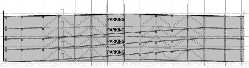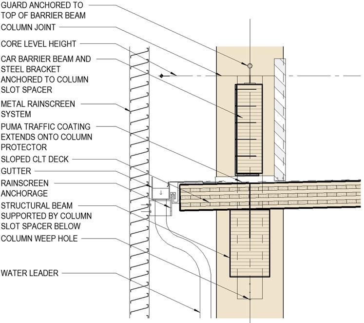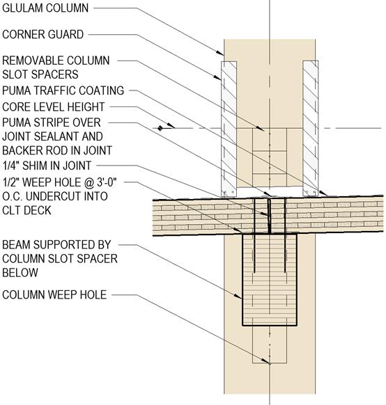 SRG Partnership (now CannonDesign) and KPFF developed an awardwinning design in 2016 of a 360-stall mass timber garage in Springfield, Oregon. The proposal featured advanced engineering concepts, including mass timber rocking shear walls and post-tension cambered glulam girders to achieve sloped decks (Ellowitz 40). Physical testing of various traffic toppings including polyurethane and asphalt was performed at the University of Oregon. Performance of polyurethane and asphalt was demonstrated to be adequate for moisture protection of the wood, with asphalt being selected because it spreads point loads, protecting the softwood decks from local plastic deformation and resultant moistureprotection failure. The design is not intended to be convertible to other occupancies nor are the components of its complicated structural design suited for disassembly and reuse in any other configuration than the garage.
