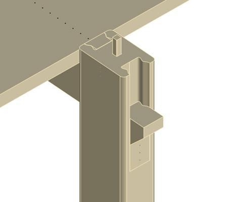 The Phase 1 decks are sloped for drainage purposes. Raising and leveling the floor decks to the elevator landing level of each floor requires raising the beams that are set at various heights on the columns. First, column slot spacers above the beams are removed by unscrewing and horizontal removal. Then, jacks supported on the floor below raise each beam (and the decks supported by it) to level the decks. To avoid overstressing the screws that secure the decks to the beams, raise beams sequentially, 3" at a time, before returning to the first beam and repeating the process. When all beams have been raised to the appropriate height, relocate the dovetail spacers below the beams and secure with the setting screws. Jacks can then be lowered so that the beams rest on the spacers.
