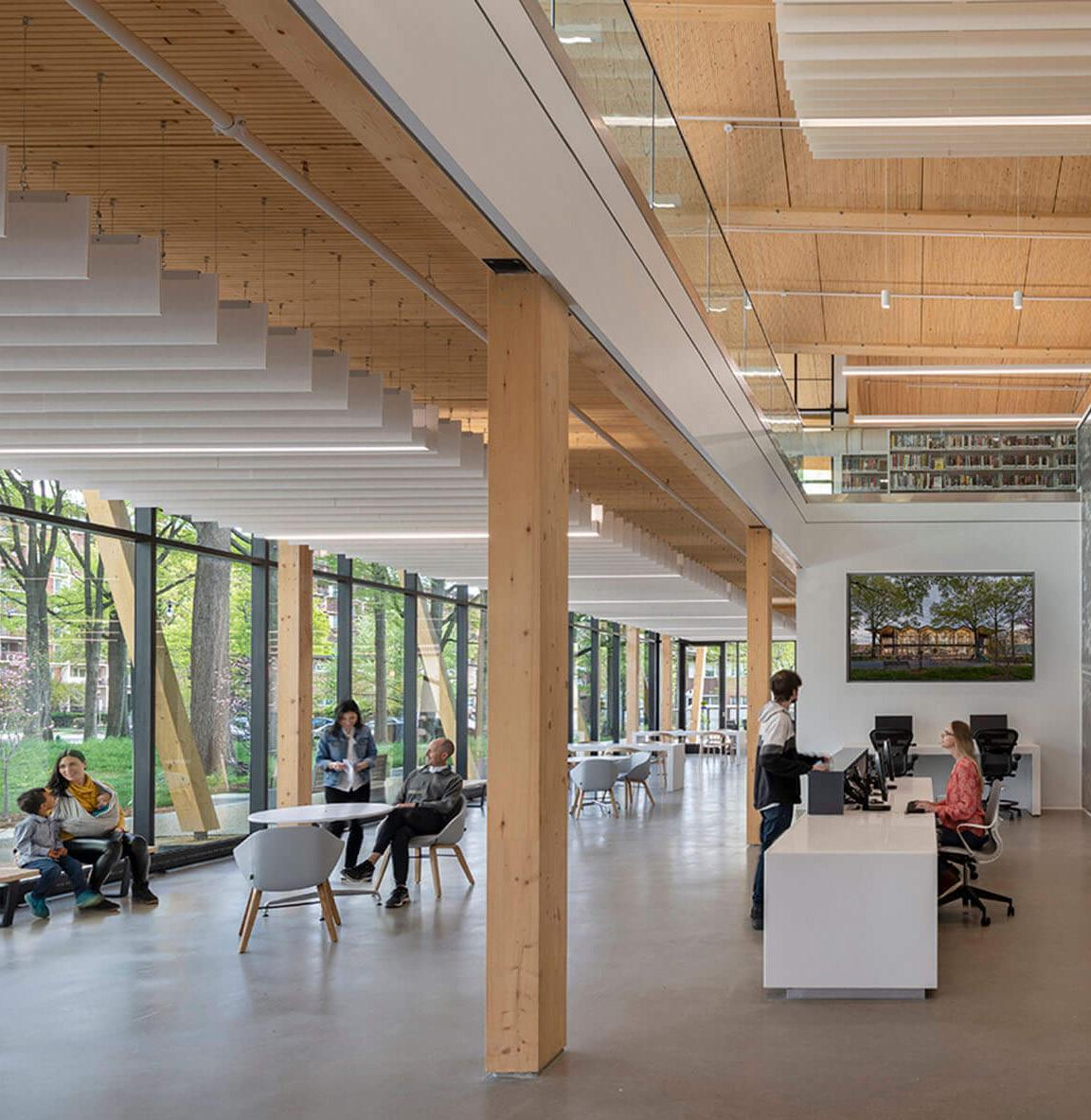 Approach the design process with a mindset of overall material efficiency. Minimize the use of raw materials, through design optimization and by preferring reclaimed materials. In addition, use mass timber to achieve multiple performance requirements (acoustic, thermal, structural, fire protection) reducing the need for other materials. Finally, reduce complexity to increase efficiency, flexibility, and resilience.