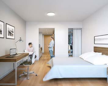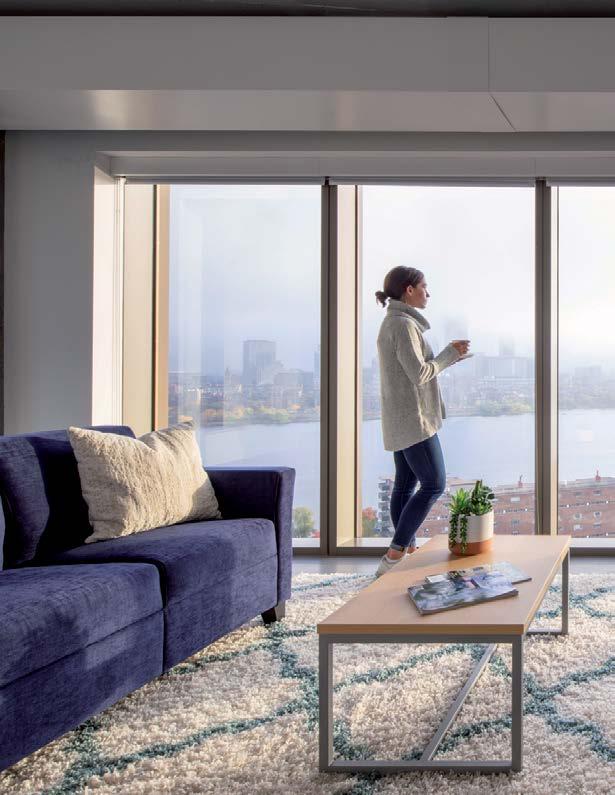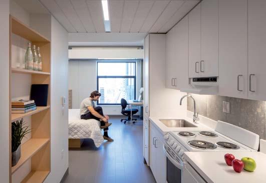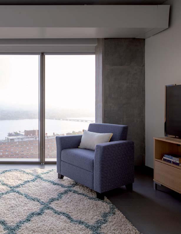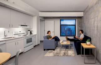 Graduate student apartments in a mix of one-bedroom, twobedroom, and efficiency units on the upper levels of the tower.