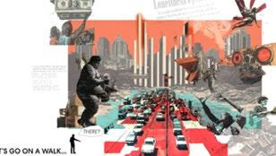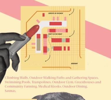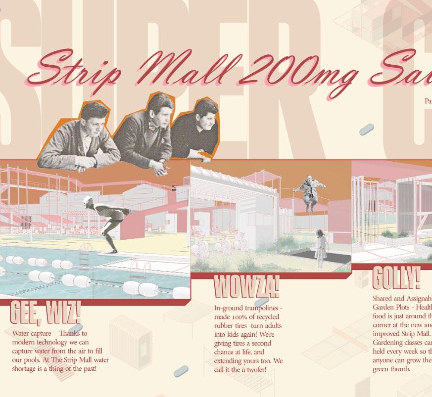 typology, the team reinforced the idea that systemic health challenges cannot be addressed by a single building. Instead, they proposed a modular, repeatable system based on the unit of the parking space—scalable and flexible enough to adapt across communities. The project also tackled loneliness, using the mall as a site for active and social programming to boost emotional and social wellbeing. Activities like climbing walls and trampolines gave adults the chance to move, laugh, and feel like kids again.