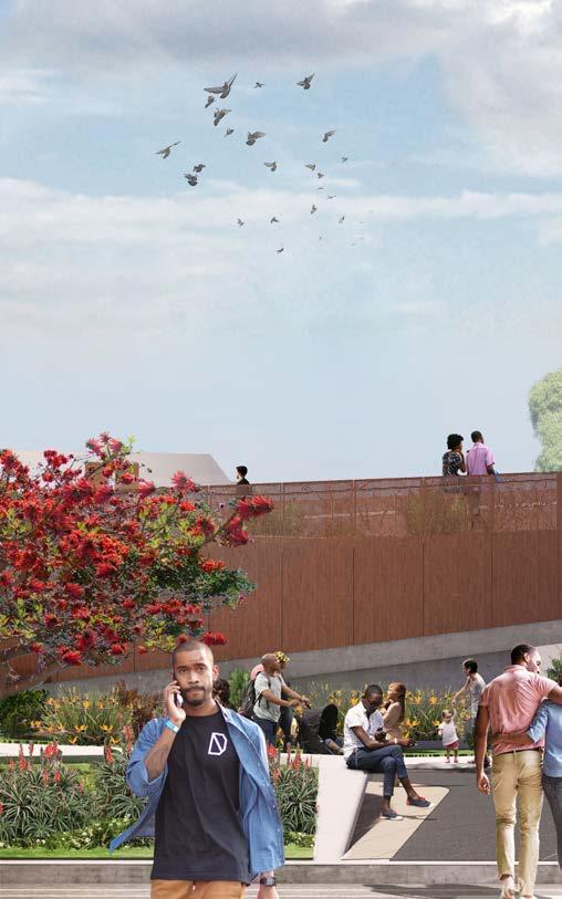 Designed by a team led by Black architects from Perkins&Will, Destination Crenshaw integrates local artwork with landscaping in six community spaces, six prominent crosswalks, and signature shade structures. The project celebrates the resilience of the African diaspora while re-connecting the community and providing an economic boost to businesses around the new station and along the corridor. Opening is anticipated in the spring of 2023.