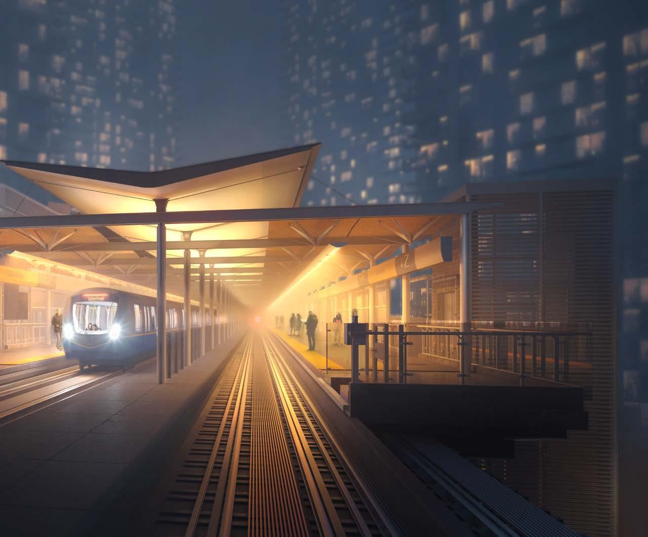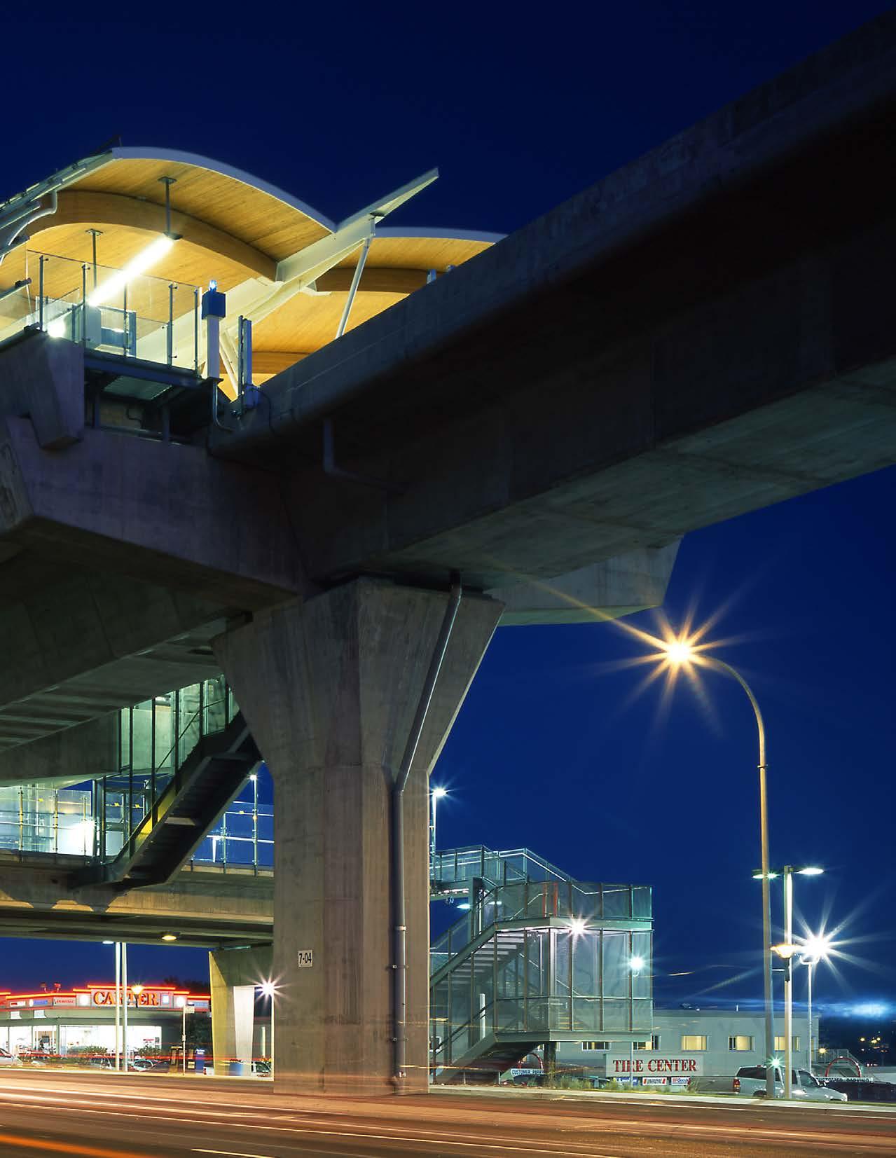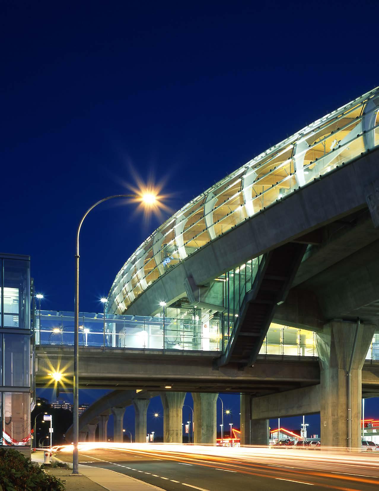 For Vancouver’s SkyTrain stations, like many of our transit projects, the integration of wood components and prefabricated modules -- a kit-ofparts -- offered much more than simply a bold identity for the new line. Given its unique properties, the material was well suited to a modular approach to construction, allowing for components to be prefabricated off-site. This ensured a high quality of final product as components were created in a controlled environment. It also supported proper project phasing, and reduced construction time which resulted in costs savings for the greater project. Our team delivered the stations on budget and three months ahead of schedule, minimizing disruption to local businesses and traffic.