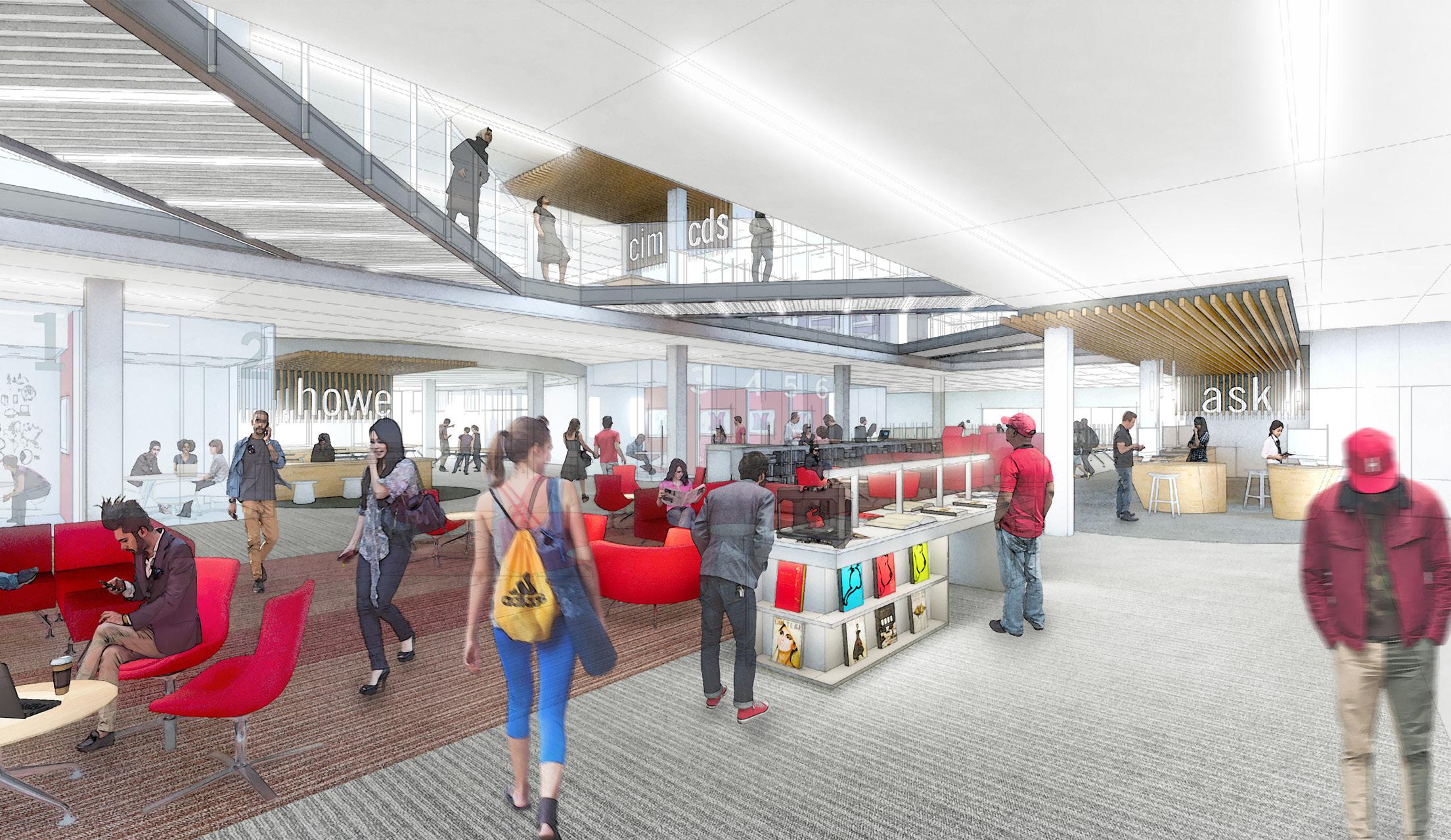 Embedded within a six-story mid-century modern Student Center, the new Library + Learning Commons provides a vibrant heart at the center of campus where openness and transparency drive the character and feel of the interior space. A voluminous and active 3-story “Living Room” allows for an immediate understanding of the Common’s organization of open trays and glazed study rooms. A vibrant gradient of yellow and red set against neutral tones creates a respectful humanistic dialogue within the Brutalist character of the interior shell.