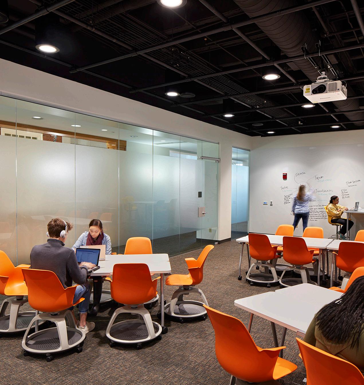 To strike a balance, the outside of the new building is brick to complement the historical aesthetics. Inside, it’s another world that pops with Tiger orange, suspended see-through “project lab boxes,” and a slightly elevated floor plan that accommodates wiring and conditioned air, all while supporting a movable wall system.