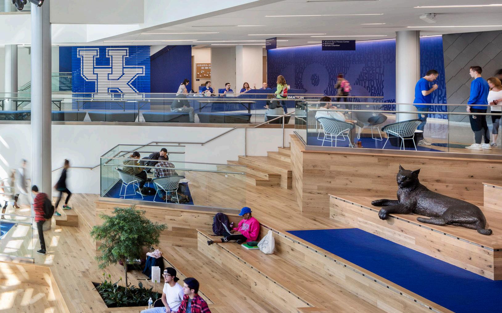 A revitalization of the original 1938 Student Center into state-of-the-art student organization and meeting space and transformation of the 1924 Alumni Gym into a dynamic fitness and recreation center. Forming a connecting link between downtown Lexington and the campus, the multi-level activity hub creates an indoor extension of the outdoor plaza.