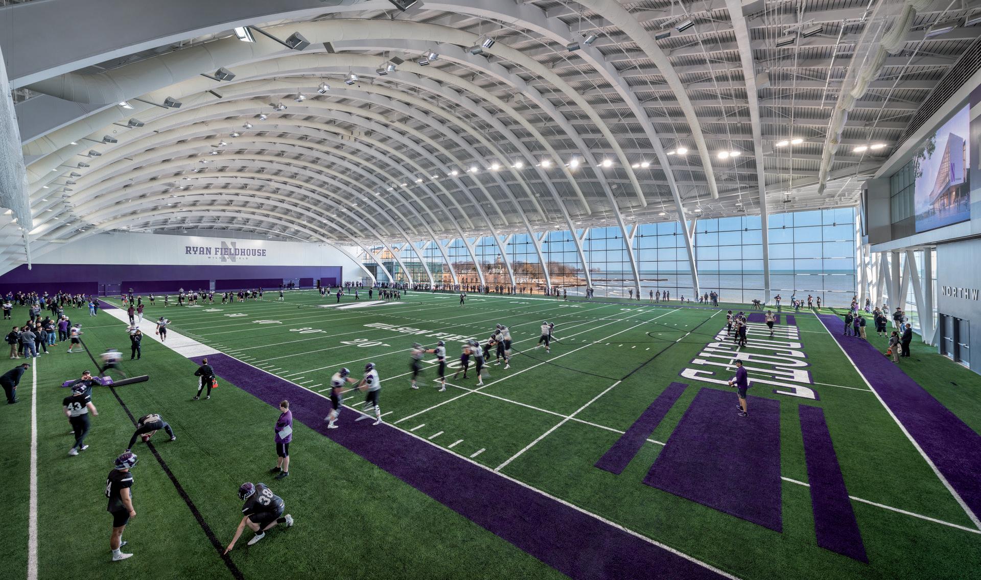 The Ryan Fieldhouse and Walter Athletics Center is a transformational athletic expansion on Northwestern University’s Evanston campus. To optimize the student-athlete experience, we designed a sleek, sophisticated destination–one that takes full advantage of the vista over Lake Michigan and the panorama of the Chicago skyline. Abundant ceiling-to-floor windows give way to jaw-dropping views of the natural and urban landscape, ushering in natural light at nearly every turn. And, despite being located on a constrained site, the monumental facility seamlessly integrates with the surrounding campus, never calling too much attention to itself.