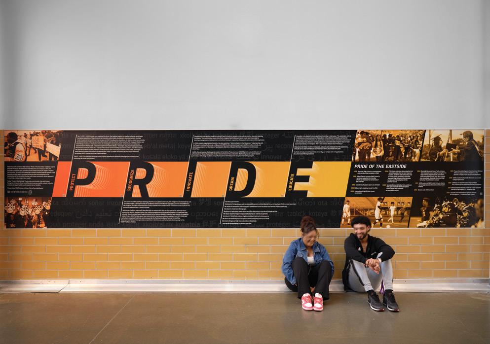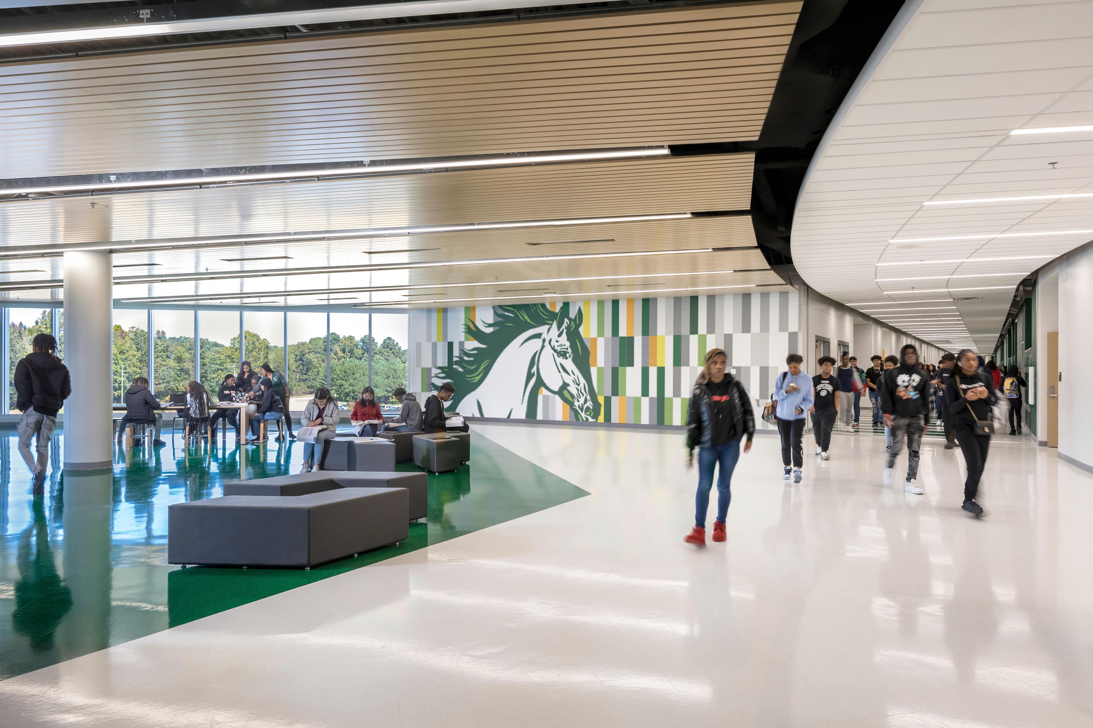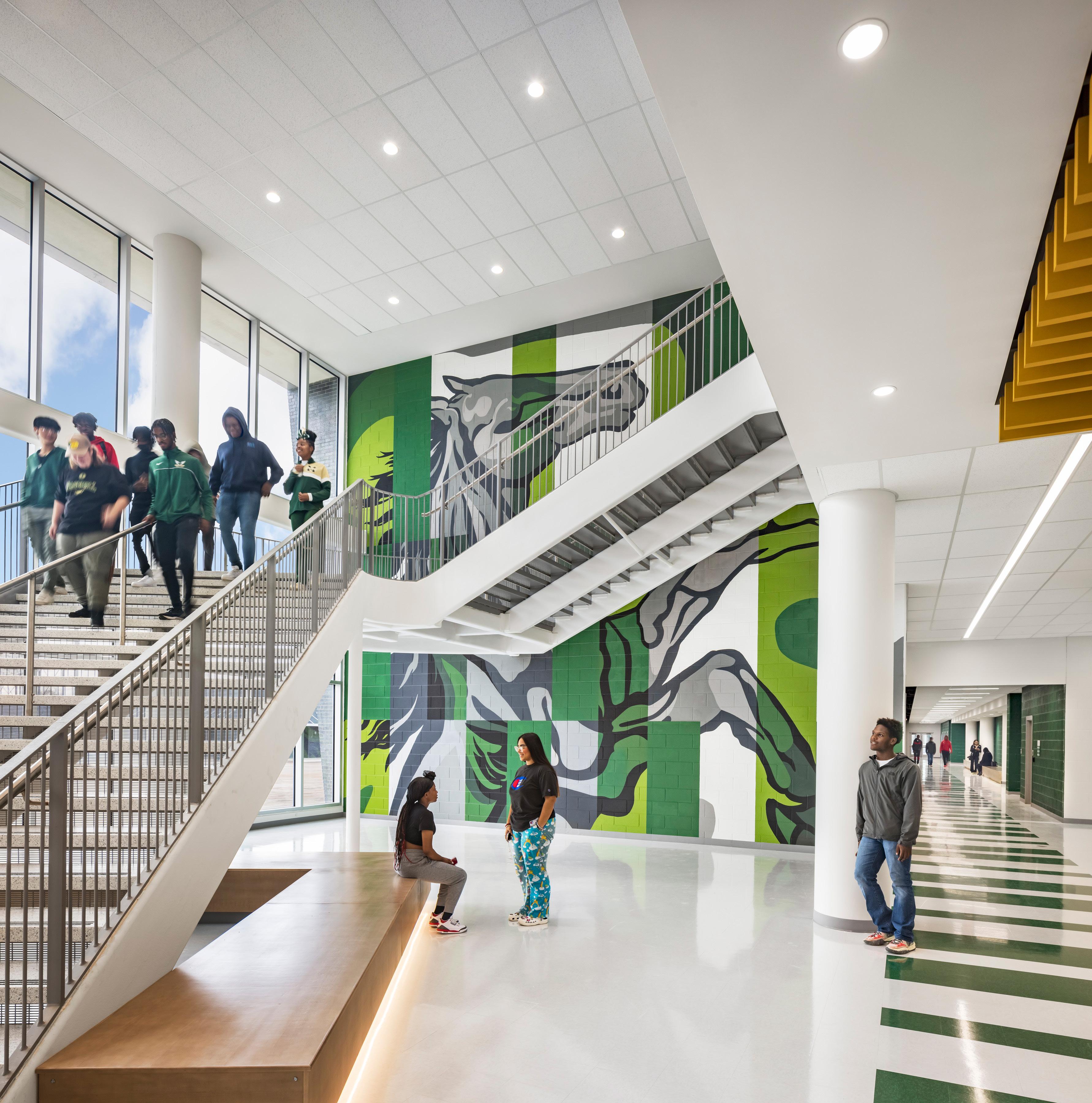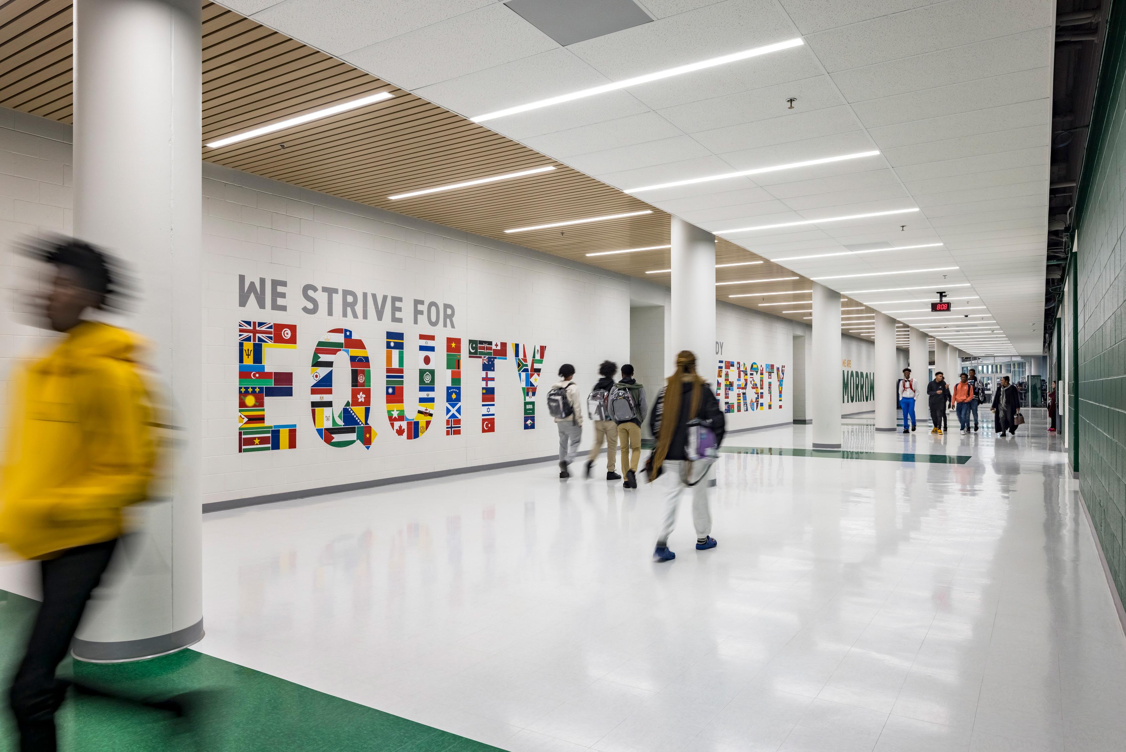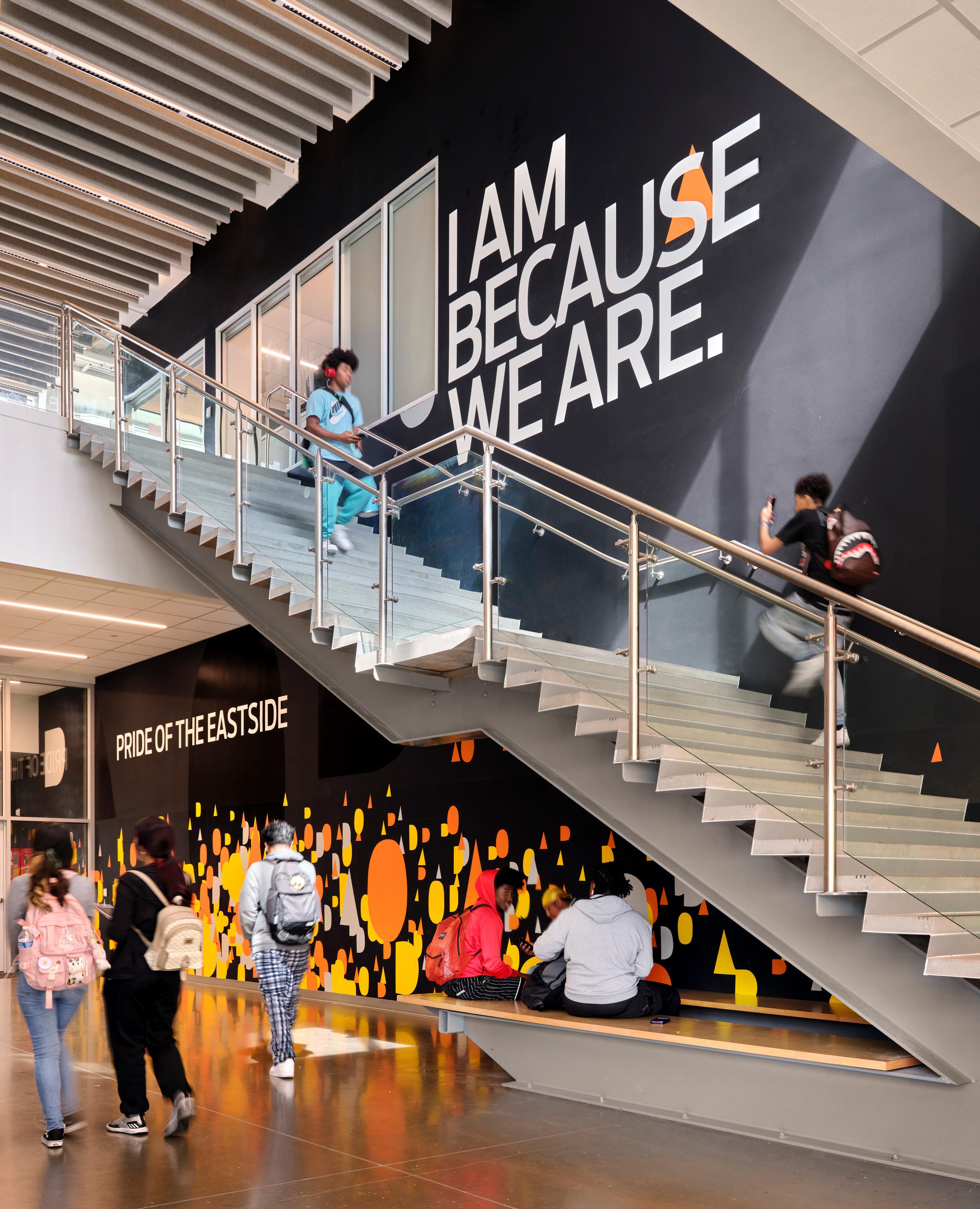Morrow High School’s branded environment, inspired by Mustang spirit and the theme “Belong Today, Belong Tomorrow,” blends bold graphics and inclusive design to celebrate unity and individuality. Woven through the S-shaped building, environmental graphics and messaging create inspiring spaces that empower students and build a lasting sense of belonging.