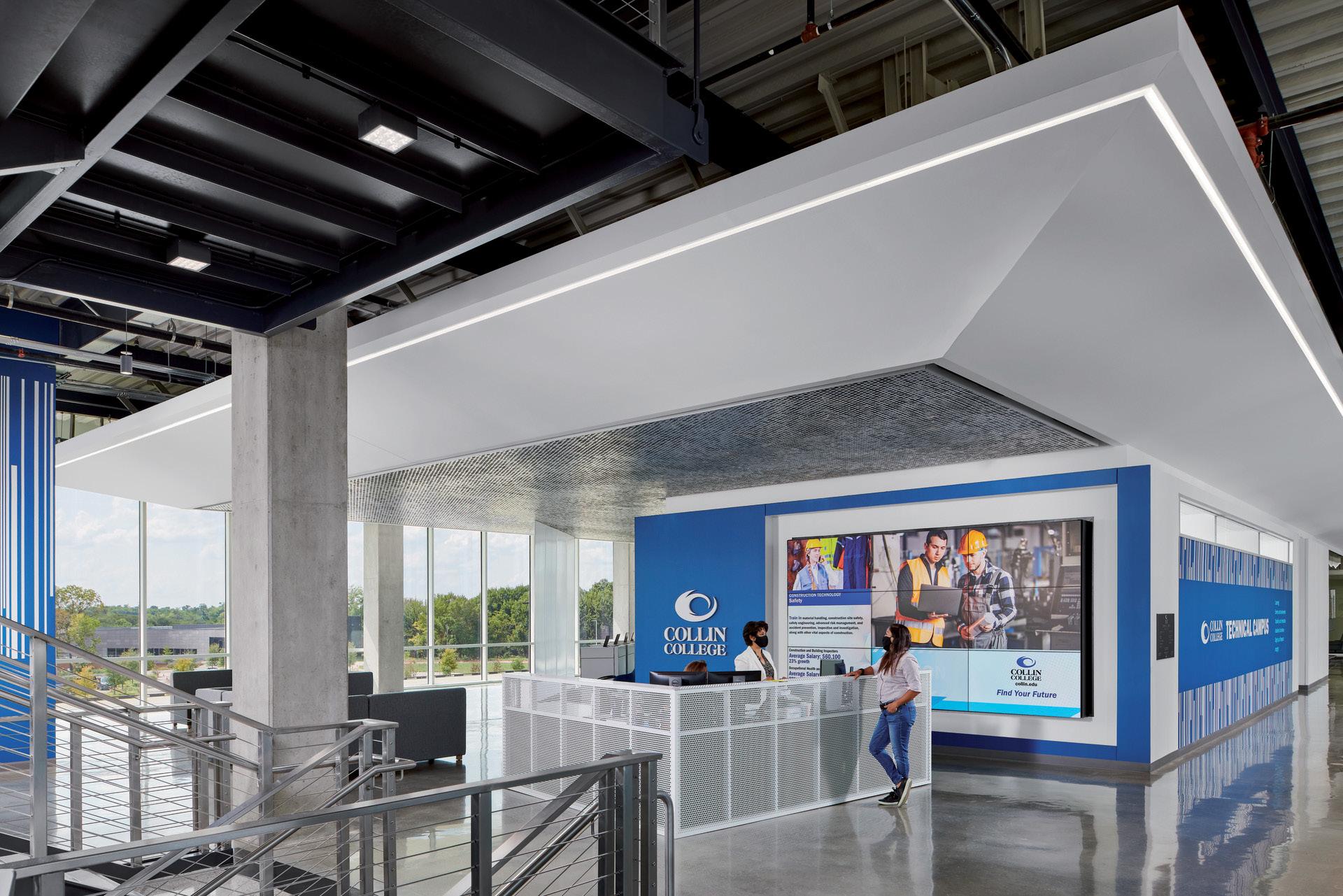 At Collin College Technical Campus, brand moments were employed to reverse stigmas of blue collars to celebrate opportunities of “white glove.” Vibrant colors guide the way- blue, yellow, green, and orange weaving through the halls to celebrate each trade. Branded graphics and intuitive wayfinding turn movement into meaning, uniting disciplines and sparking connection across a campus built for collaboration.