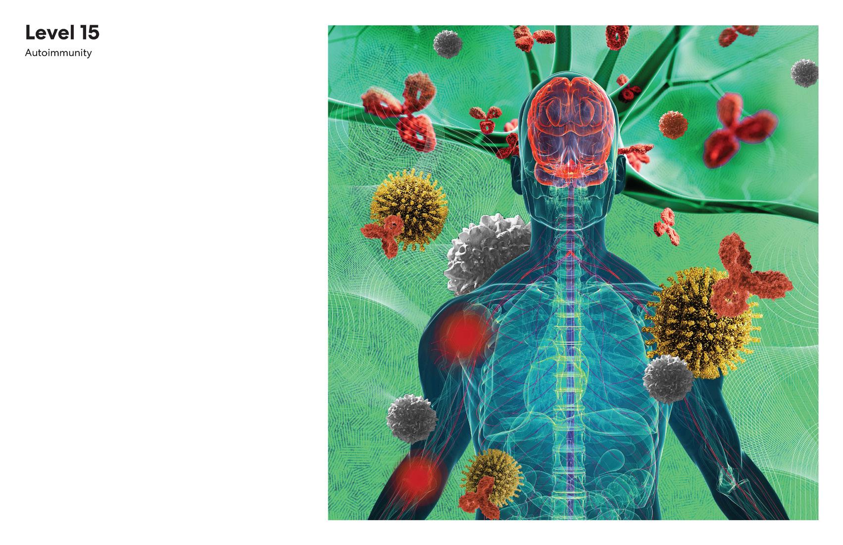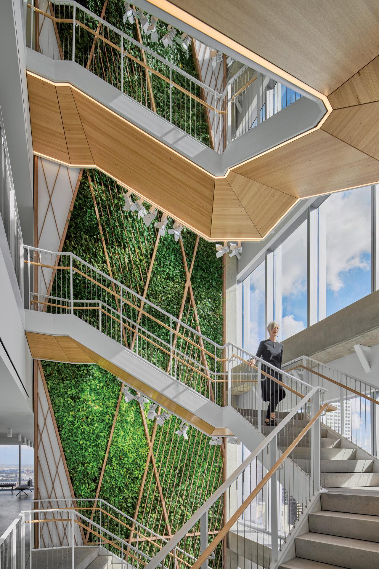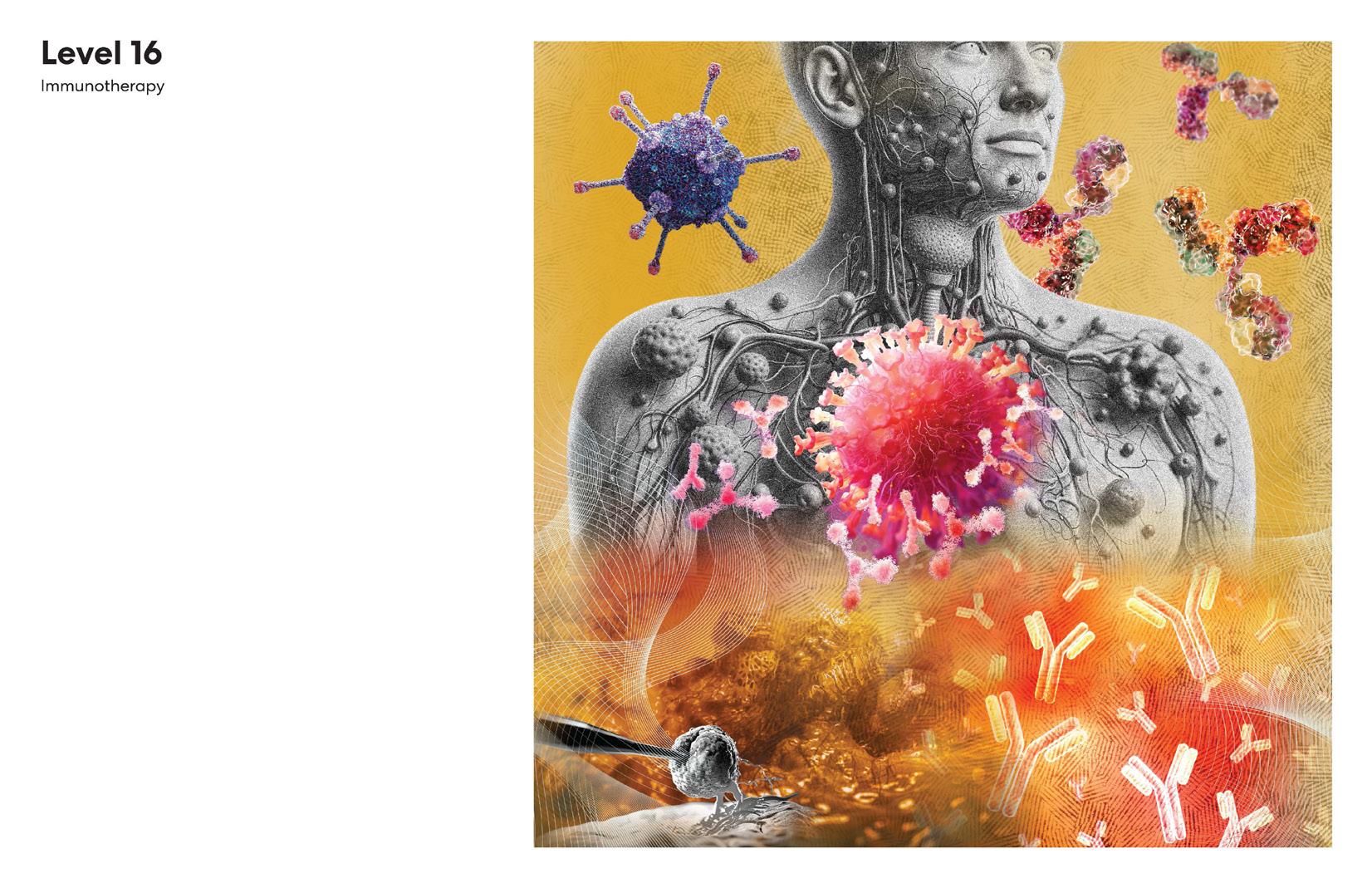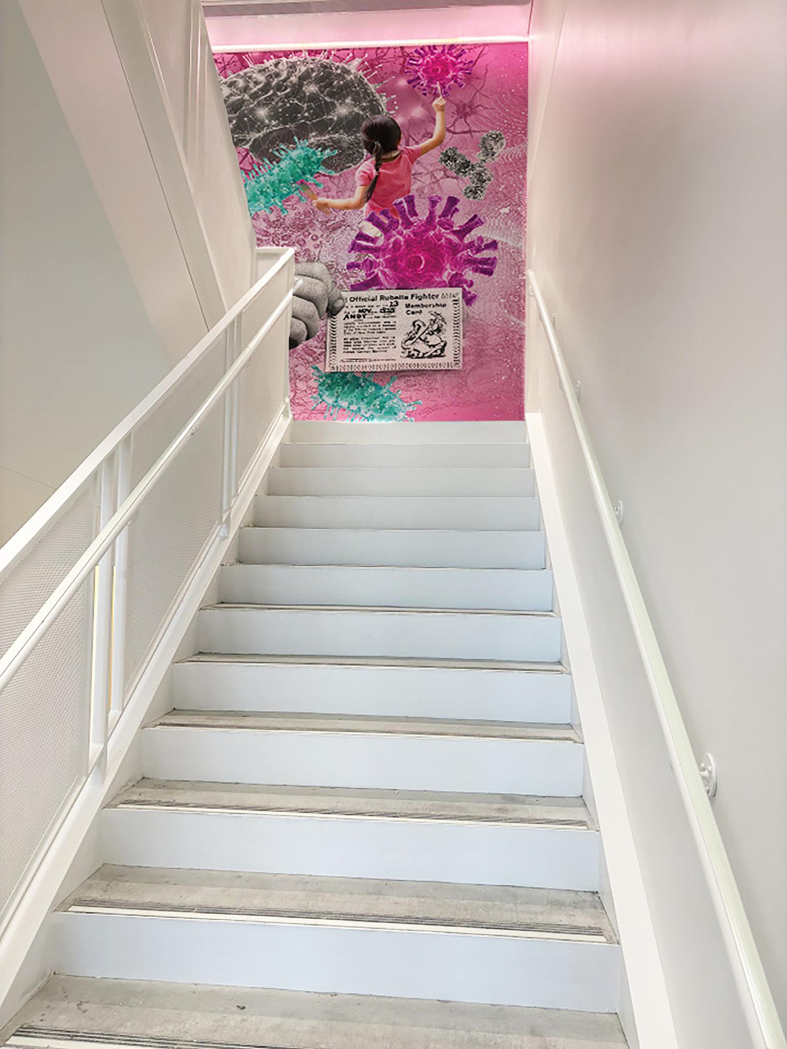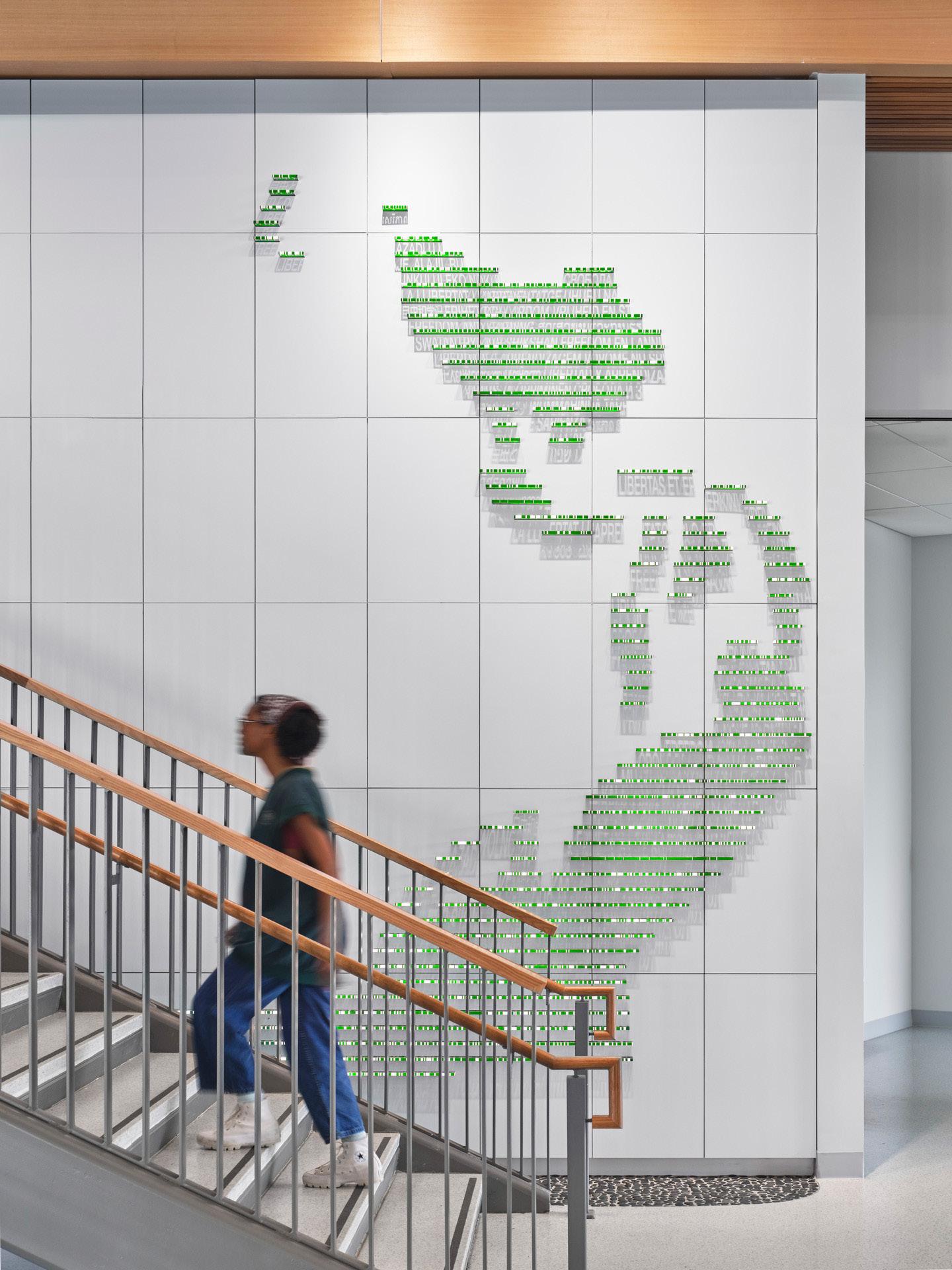 A seven-story graphic installation winds through the stairwell, thematically connecting each floor with imagery inspired by immunology, medicine, and innovation. A curtain of multicolored chains overlays the graphics, creating a shifting optical illusion that symbolizes the interconnectedness of cells, systems, and people.