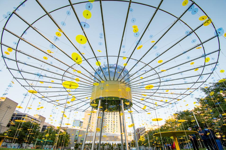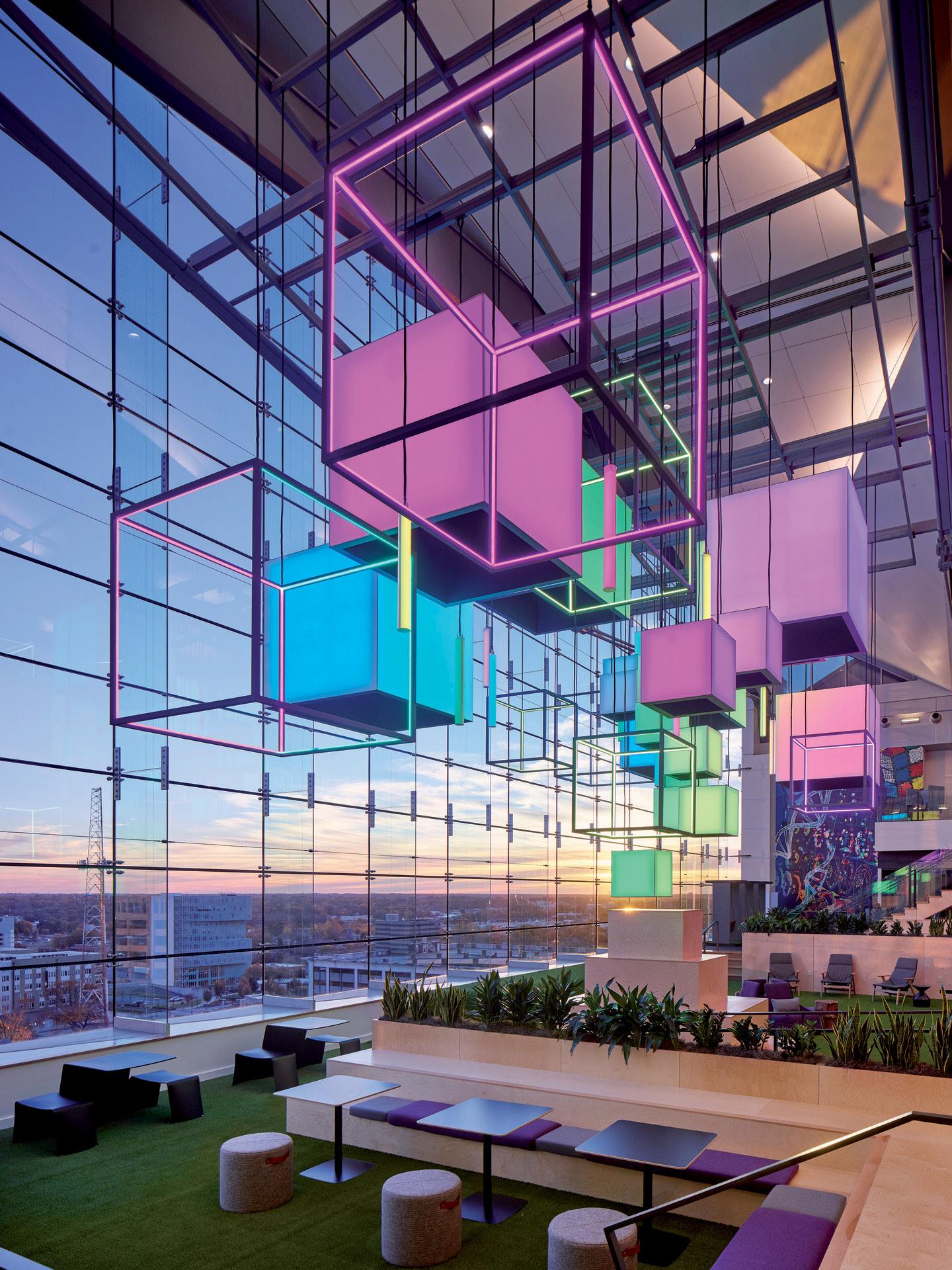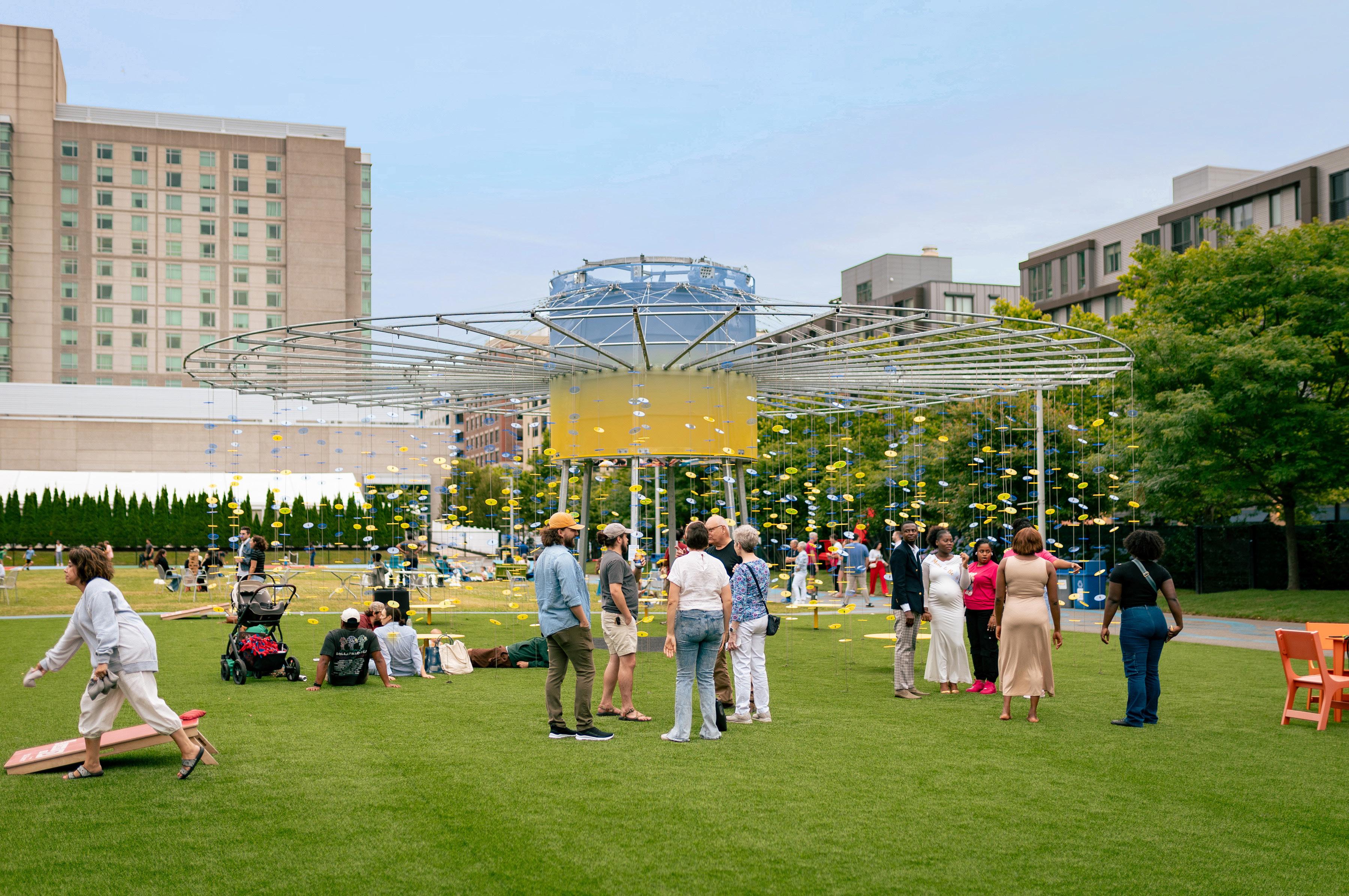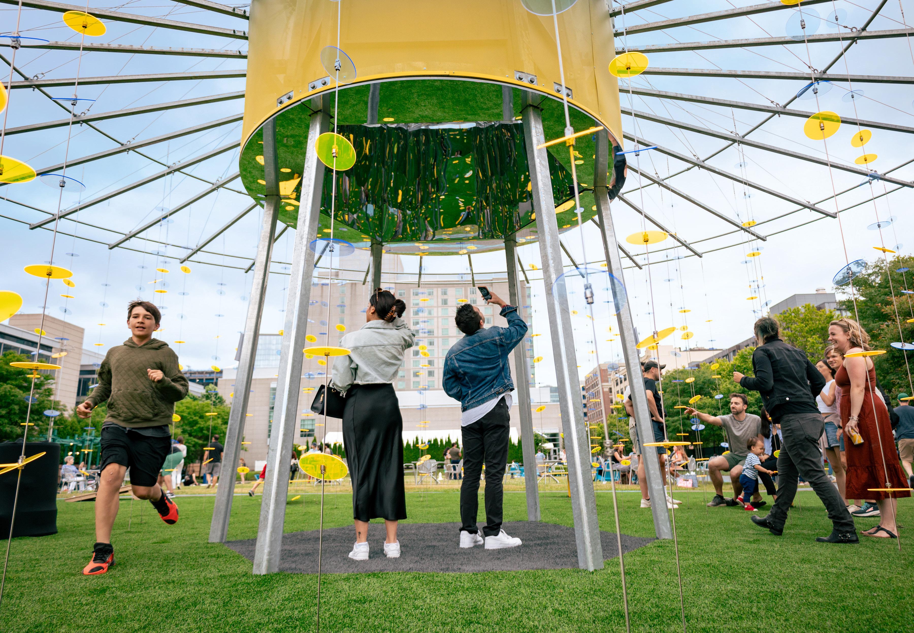 A 13’ square kinetic installation positioned at a main entry point serves as an ever-changing moment of history, messaging, and culture.