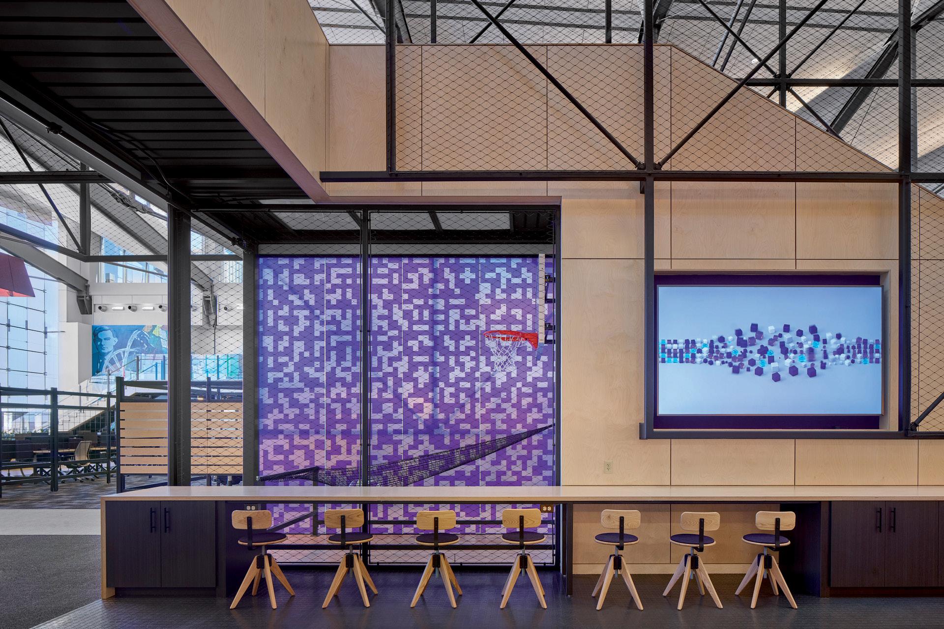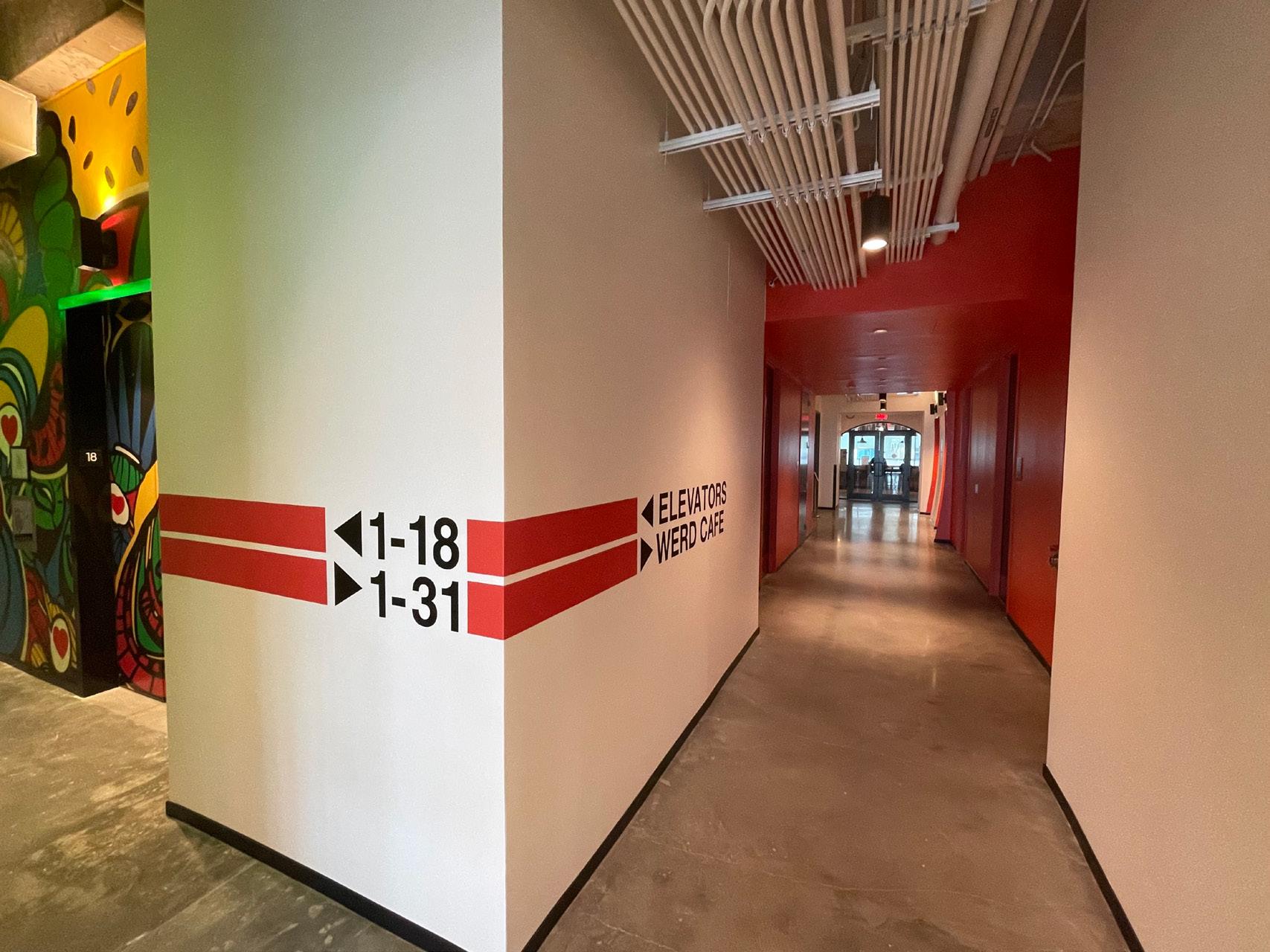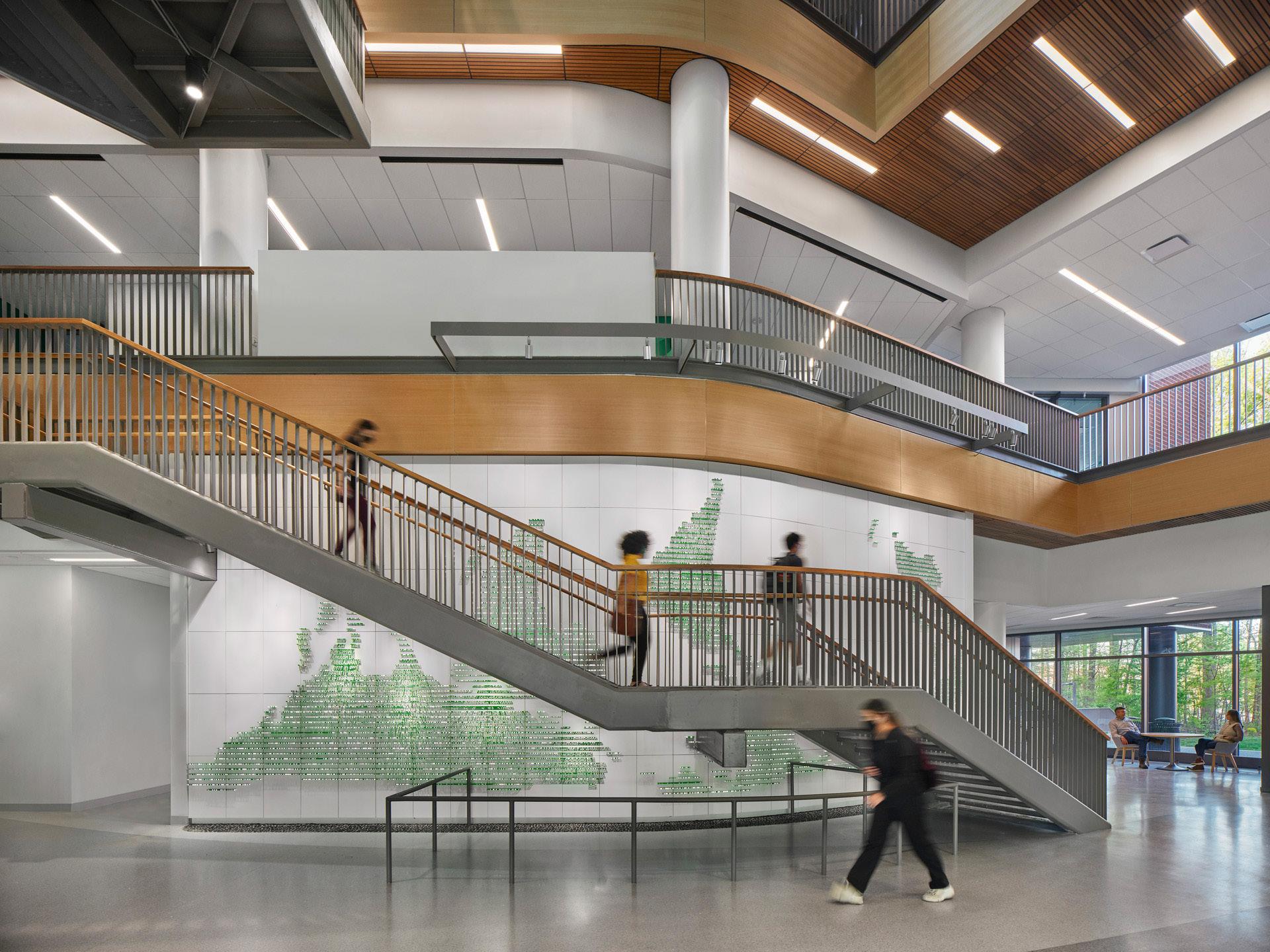 The campus’ color-coded zones aid navigation, foster a sense of community by visually connecting students across diverse technical disciplines, and reinforce notion of elevated, polished working conditions.