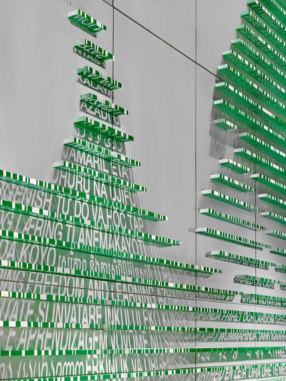 Inside Horizon Hall, language and light spark reflection and discovery and challenge universal truths. The Word Wall randomly juxtaposes quotes across time and culture to create new meaning, while the inverted World Wall casts shadows in over a hundred languages. Together, they make the humanities visible, vibrant, inclusive, and central to campus life.