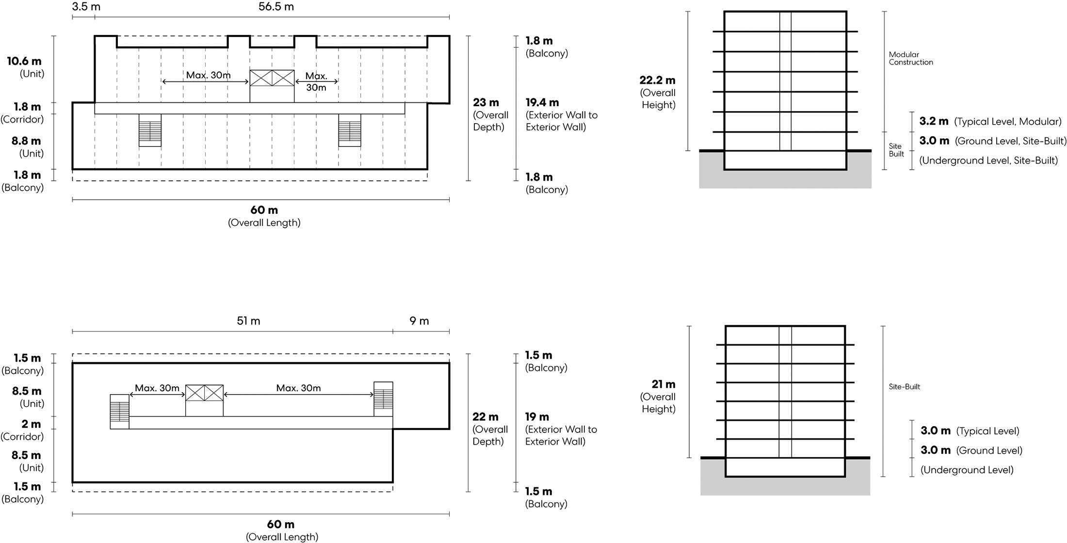 Modulous’ products are engineered with declared structures and material compositions. The clarity of product specifications makes the technical and project requirement evaluation possible at earlier stages of the project. Spaciousness of modular units is an inherent characteristic of volumetric modular construction, and it may lead to enhanced livability in affordable housing projects, but also lower area efficiency. If the volumetric modular project balances to achieve a similar cost compared to traditional construction, the more spacious unit sizes would be a significant added value in human experience. With regards to the configuration and dimensional planning, Modulous’ units ranged from studio to three-bedroom and achieved project requirements by positioning the four and fivebedroom units, which did not exist in the product catalog, within the on-site ground level construction. The modular building had similar overall dimensions compared to the proposed design.