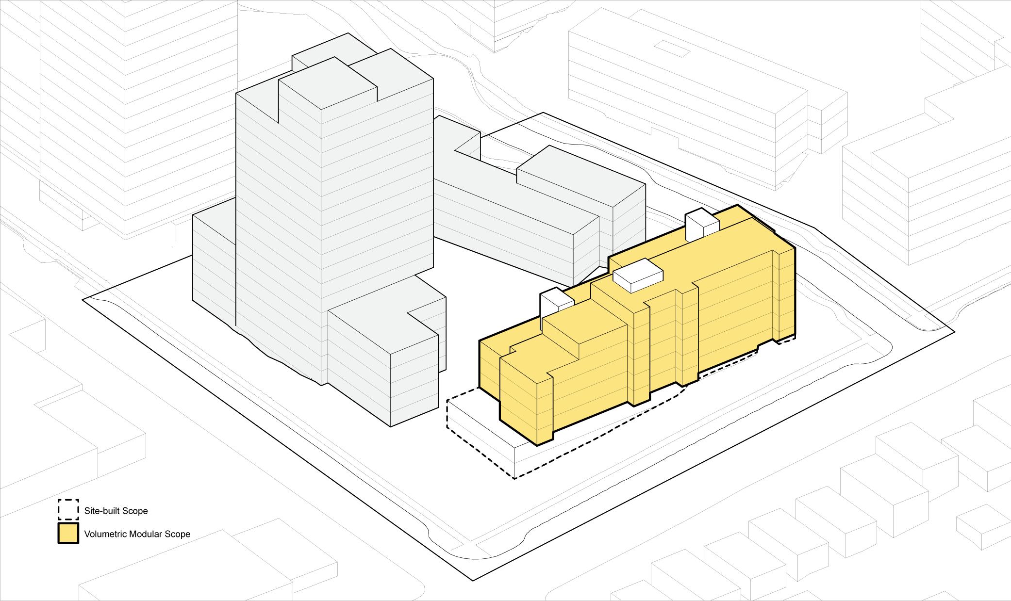 The modular building fits into similar overall dimensions compared to the proposed. The units were more spacious, which led to lower area efficiencies. If the volumetric modular project balances to achieve a similar budget compared to traditional construction, the more spacious unit sizes would be a significant added value in human experience.
