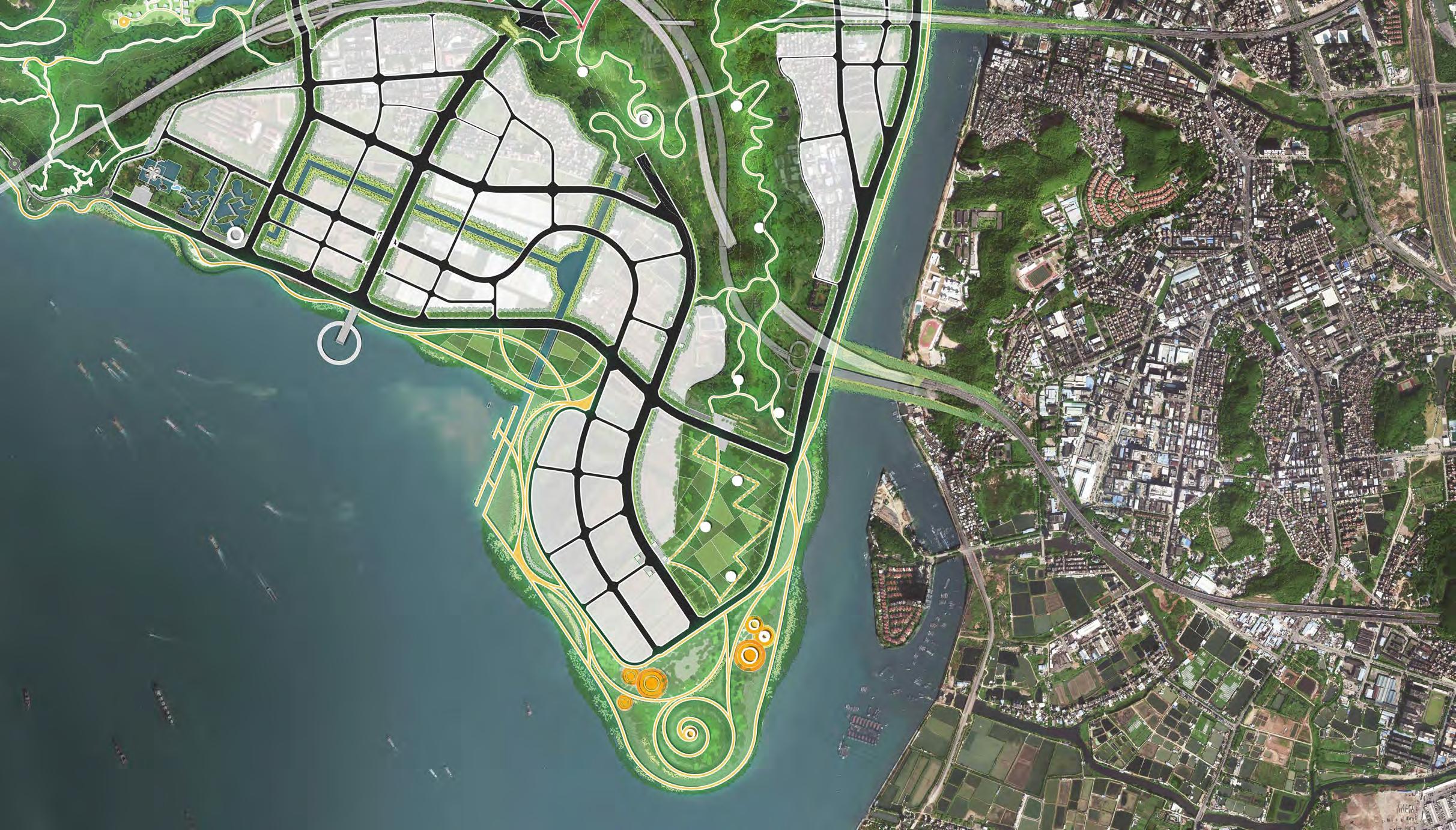 Weiyuan Island is one of the core of the expressway network in the Greater Bay Area, but the public transportation network in the island is not perfect. The design layout is based on the upcoming inter-city metro lines, driven by the public transport network, ensuring superior accessibility to each landscape node.