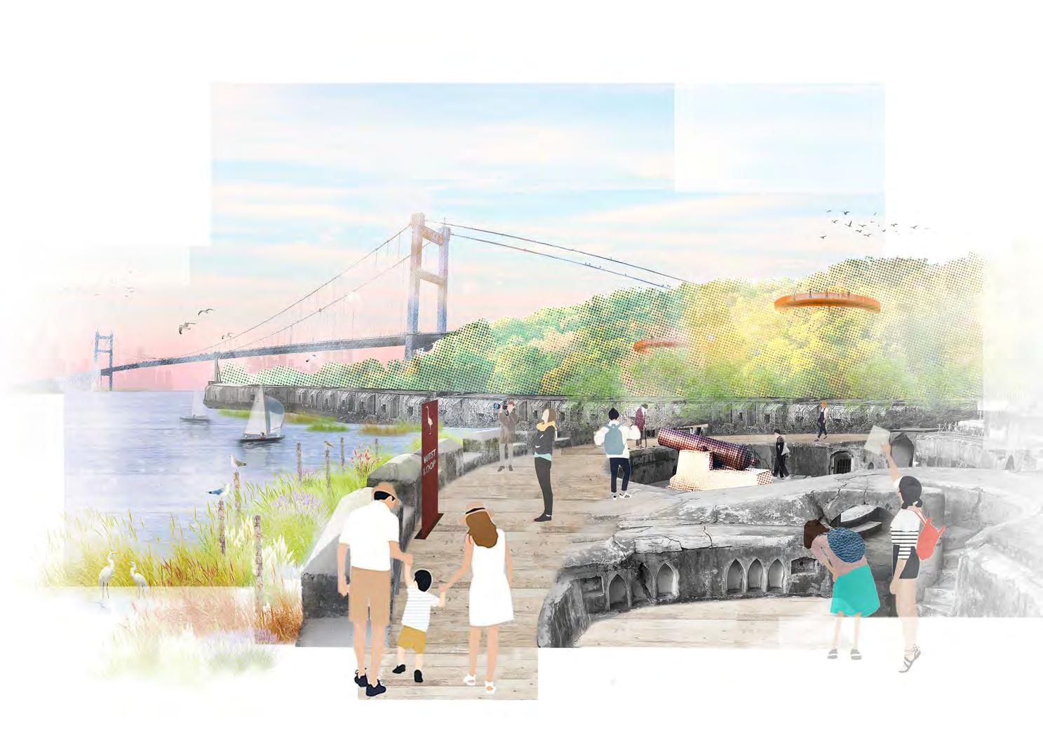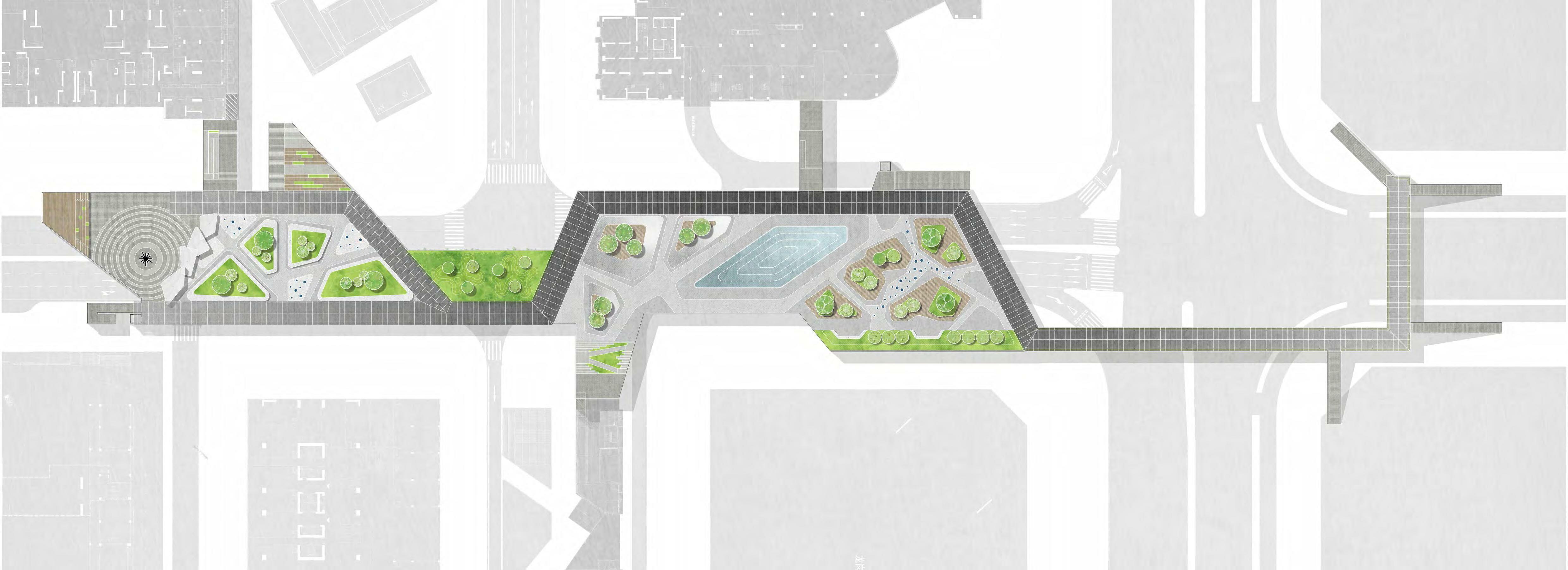 bridge deck space is separated based on the shortest common path of the predicted pedestrian flow, so as to form island space with different sizes and shapes, and to put various activities that meet the needs of different groups. The design not only meets the basic needs of the bridge, but also expands the possibility of the bridge deck space, and tries to make the bridge in the traditional sense into an interesting park.