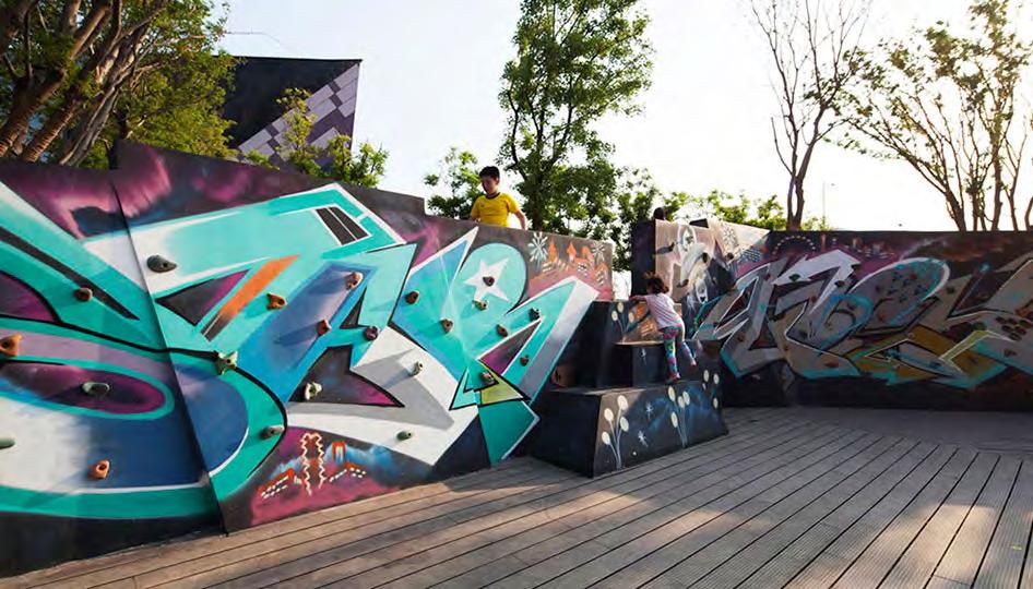 We combined with the tree pool to design some undulating islands to create a pure landscaped sculptural feeling. Terrazzo and plastic wood are used to create a slope place for people to run and play freely. It is suitable for children and young people. You can often see roller skating, skateboarding, cycling and other activities.