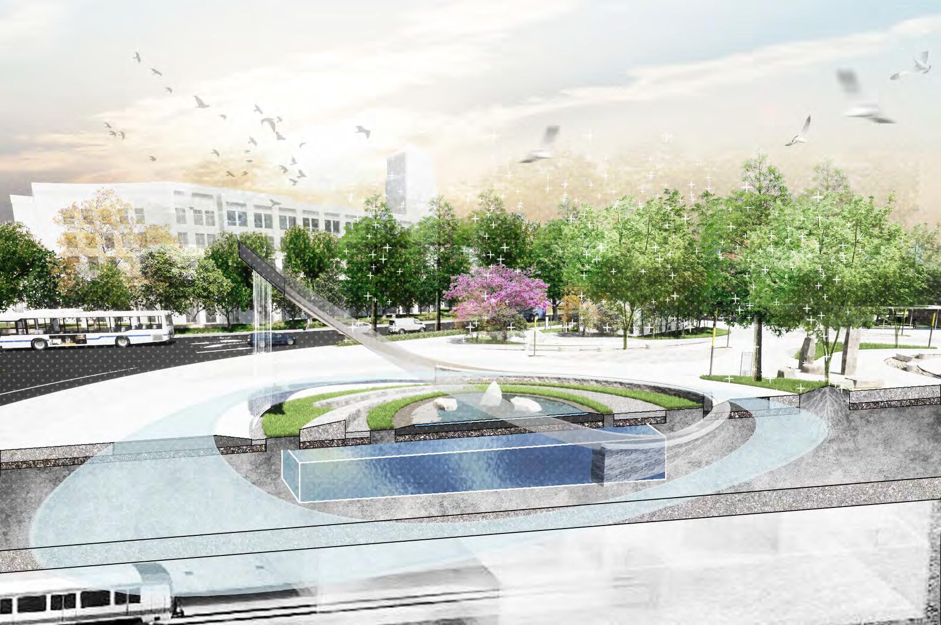 Spray plaza is located in the most concentrated area, which is also a multi-functional space. Due to the slightly sunken, a shallow pool will naturally formed in rainy day, spraying device on the ground can adjust the microclimate and increase the enjoyment. In special holidays, the plaza can be used as the temporary market area as well.