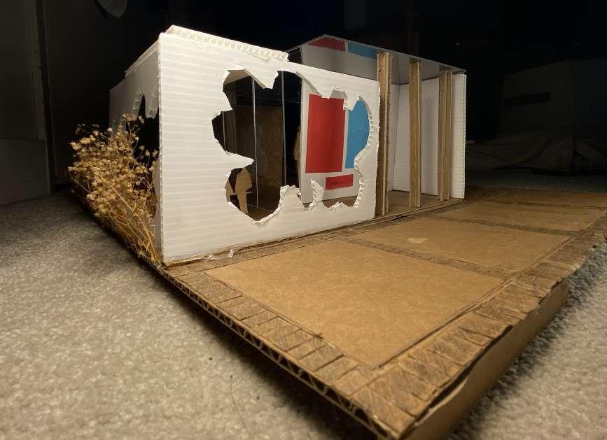This model is made of Acrylic board ,plants.wood,Cork board plastic white board.The light is a lava lamp played by an electronic device. This model is built as a community center that includes a gallery ,relaxing place ;ike dancing area or place where people could have some food ,also a special space that could put any student works ,The shapes are inspired by Mondrain and Lissitzky. So before doing this project I also transferred Mondrian and Lissitzky to real models.