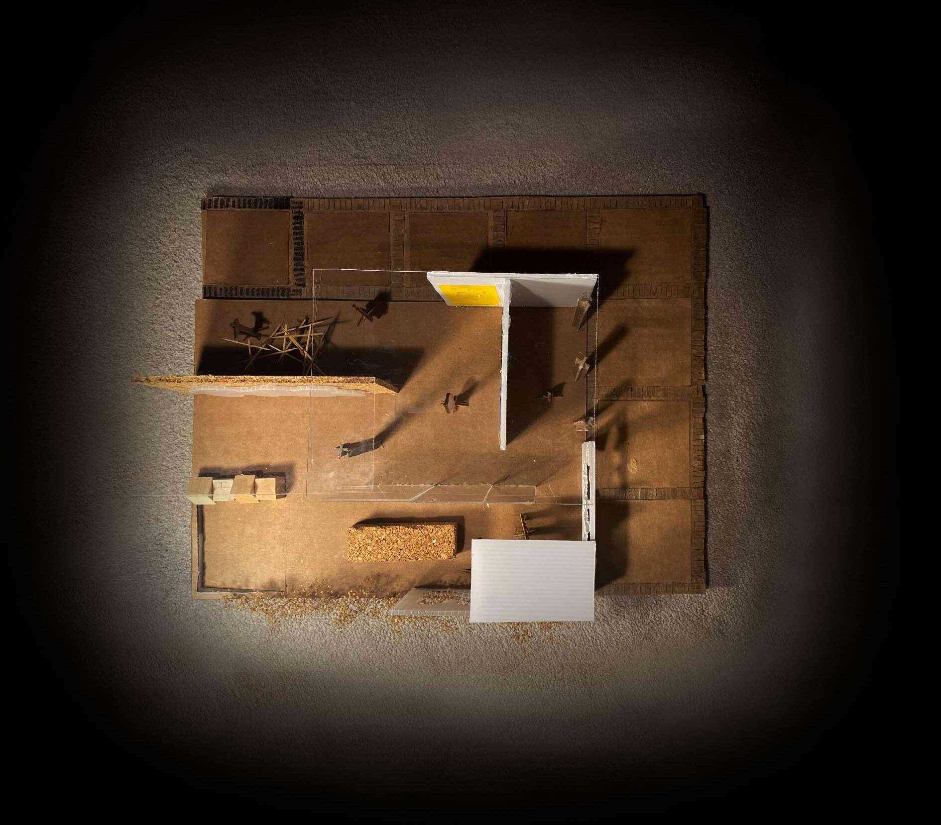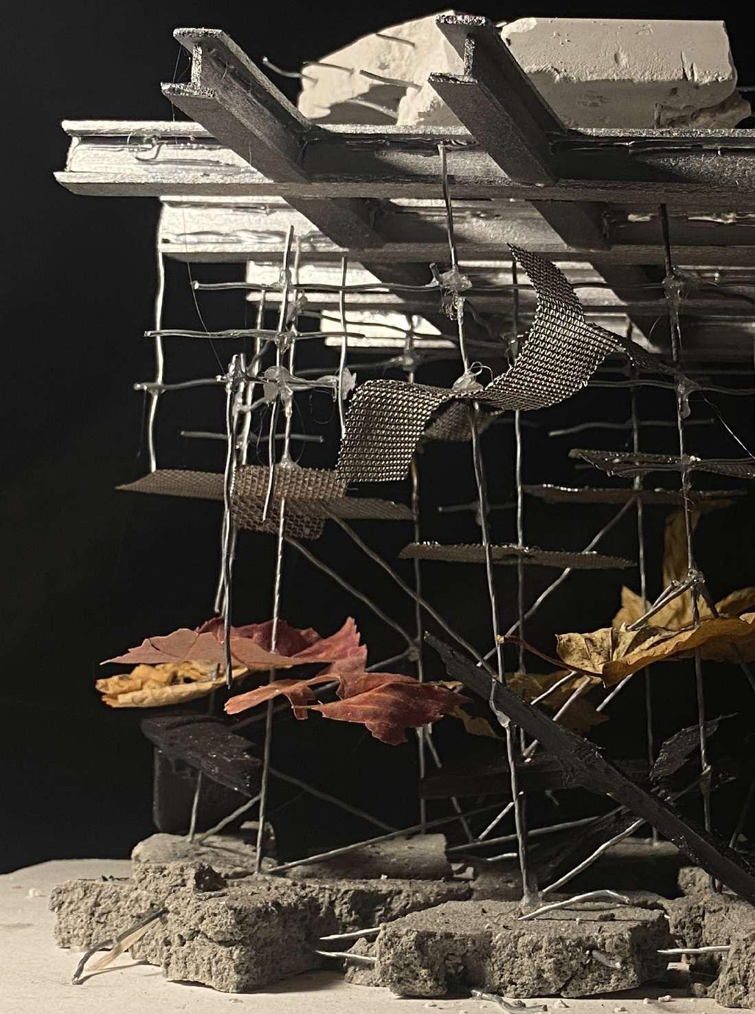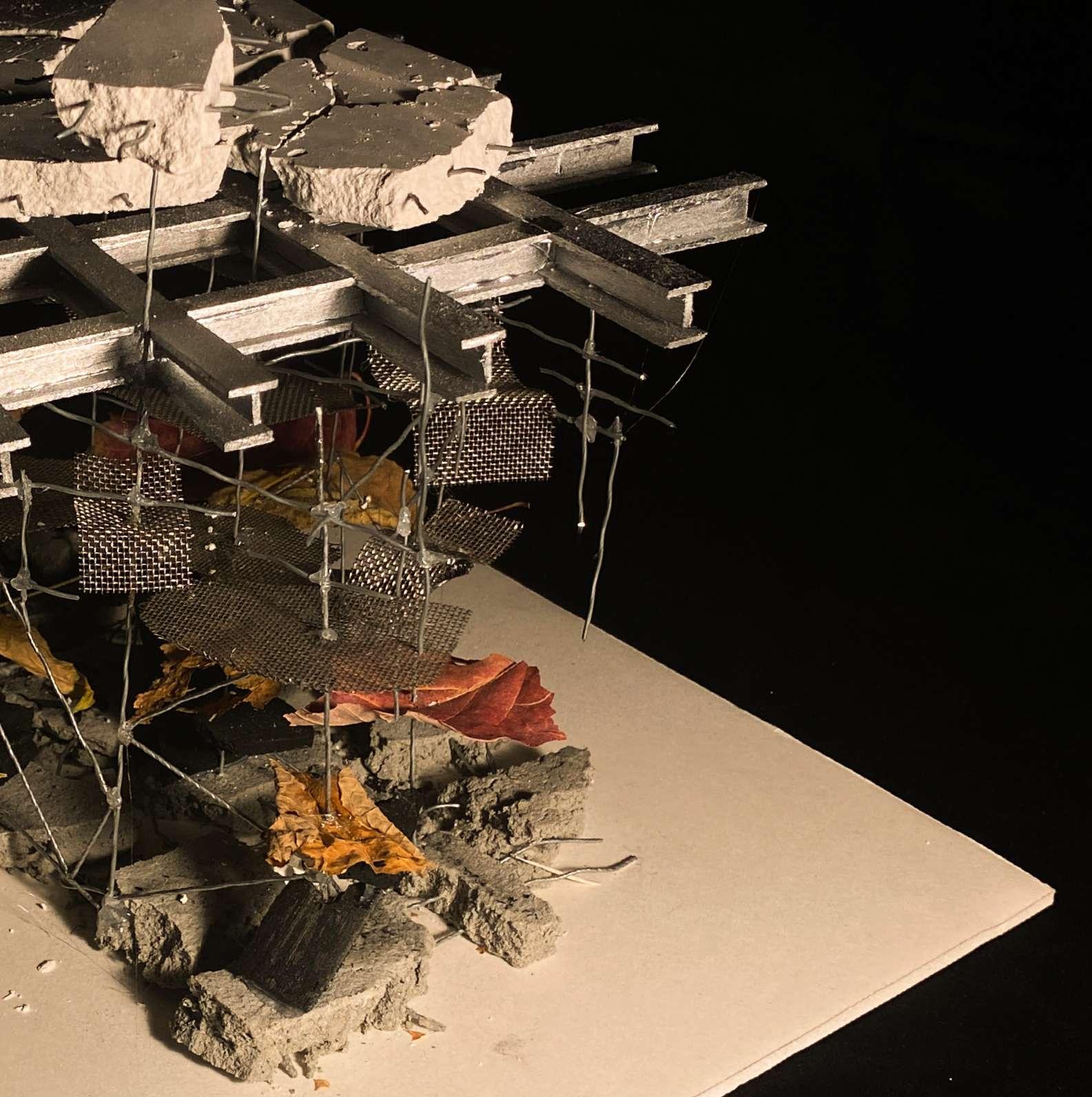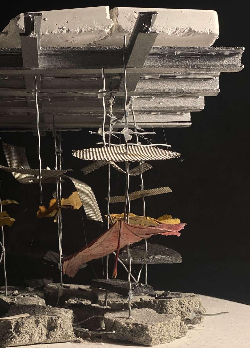 This model is made of wood board, iron wire, leaf, cement, gesso and woven wire steel. In order to connect this idea about urging people to recycle construction waste, I used the different layers of this installation, from the most basic and messy cement to the complete building. As I walked down the street, I noticed old building remnants and construction buildings, those exposed steel bars and concrete blocks scattered all over the place.